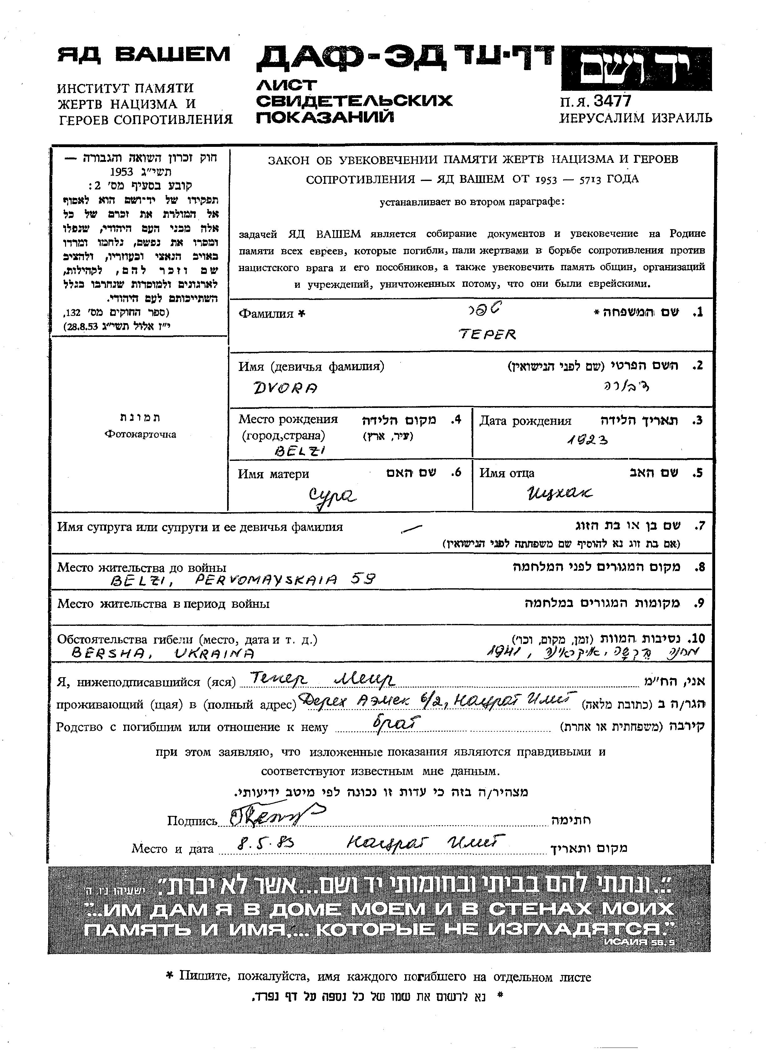 Teper Dvora 1923 Belzica, Polen Gedenkblatt