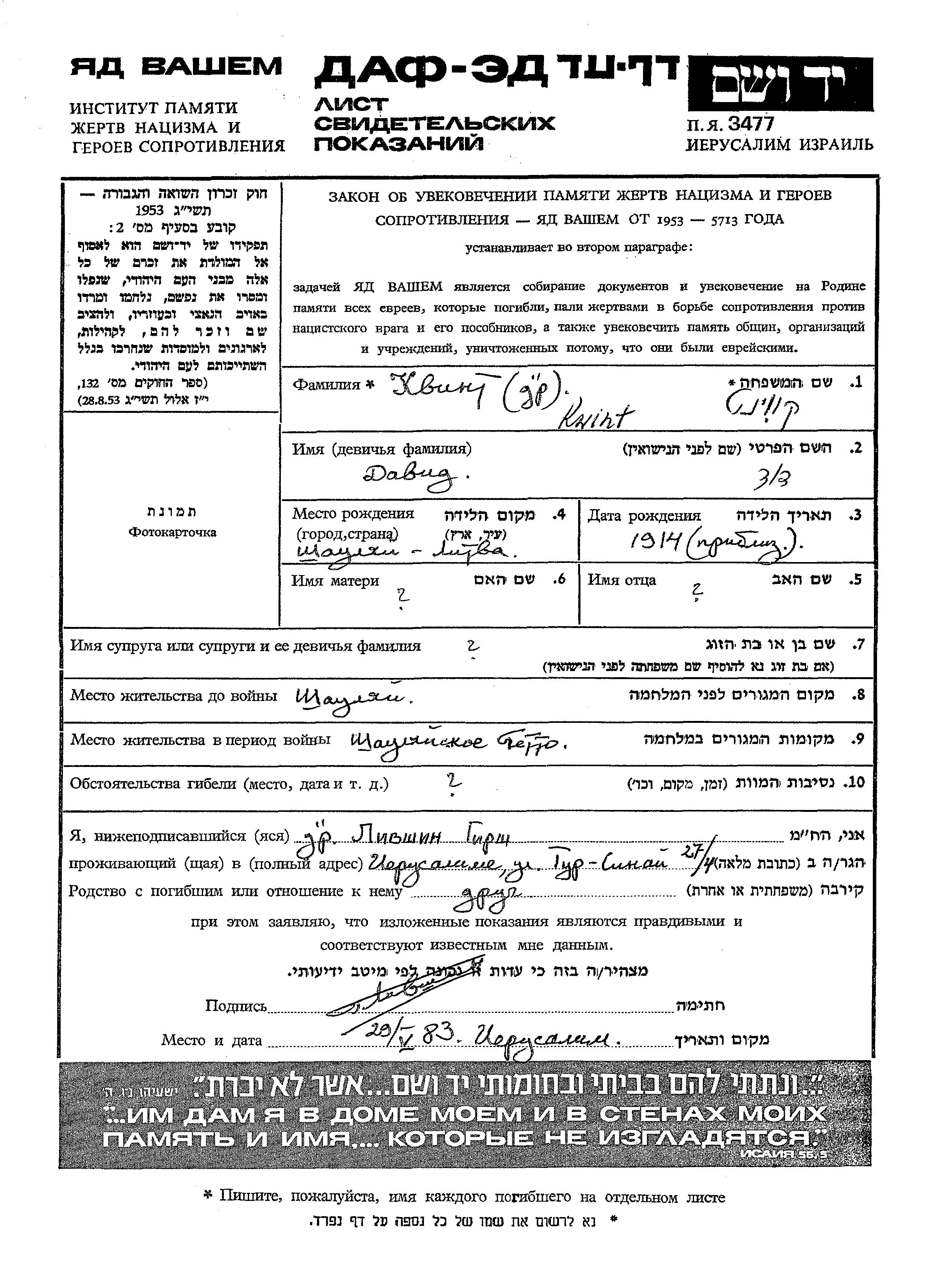 David Kvint wurde im Jahr 1914 in Shaulyay, Litauen geboren. Vor dem Zweiten Weltkrieg lebte er in Shaulyay, Litauen. Während des Krieges war er in Shaulyay, Litauen.