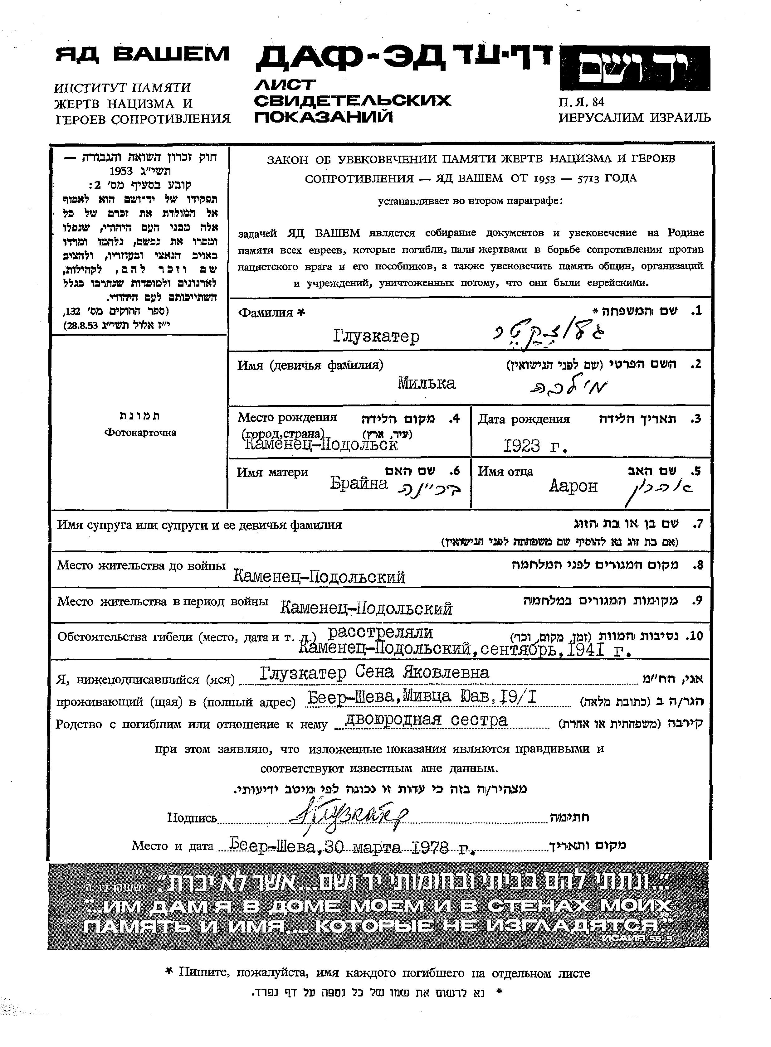 Milka Gluzkater wurde im Jahr 1923 in Kamenets Podolsk, Ukraine (UdSSR) geboren. Sie war die Tochter von Aaron und Braina. Vor dem Zweiten Weltkrieg lebte sie in Kamenets Podolskiy, Ukraine (UdSSR). Während des Krieges war sie in Kamenets Podolskiy, Ukraine (UdSSR).