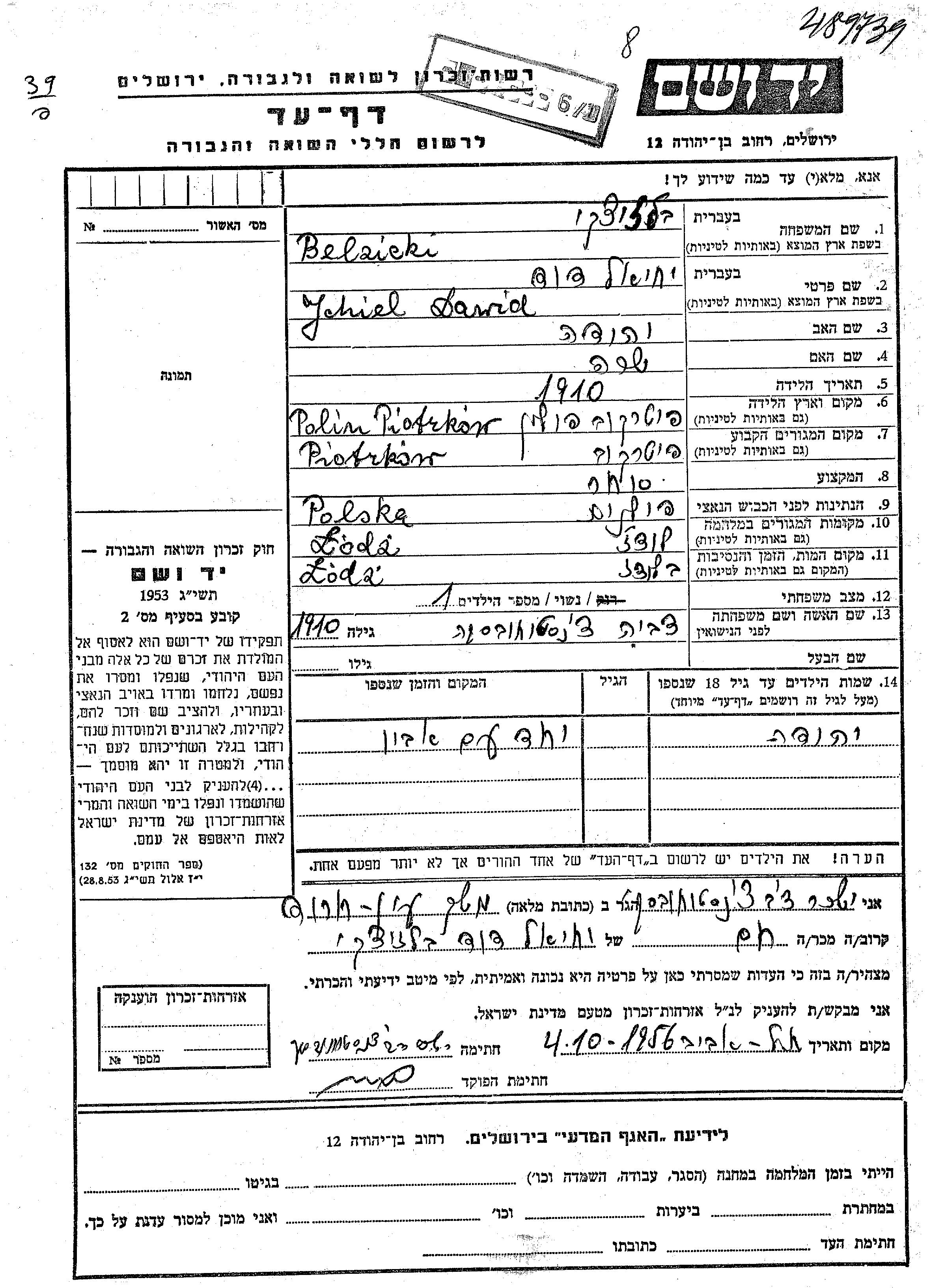 Jchiel Dawid Belzicki wurde im Jahr 1910 in Piotrkow, Polen geboren. Er war der Sohn von Yehuda und Sara. Er war Kaufmann/-frau und mit Tzvia, geb. Chenstokhovska Verheiratet. Vor dem Zweiten Weltkrieg lebte er in Piotrkow, Polen. Während des Krieges war er in Lodz, Polen.