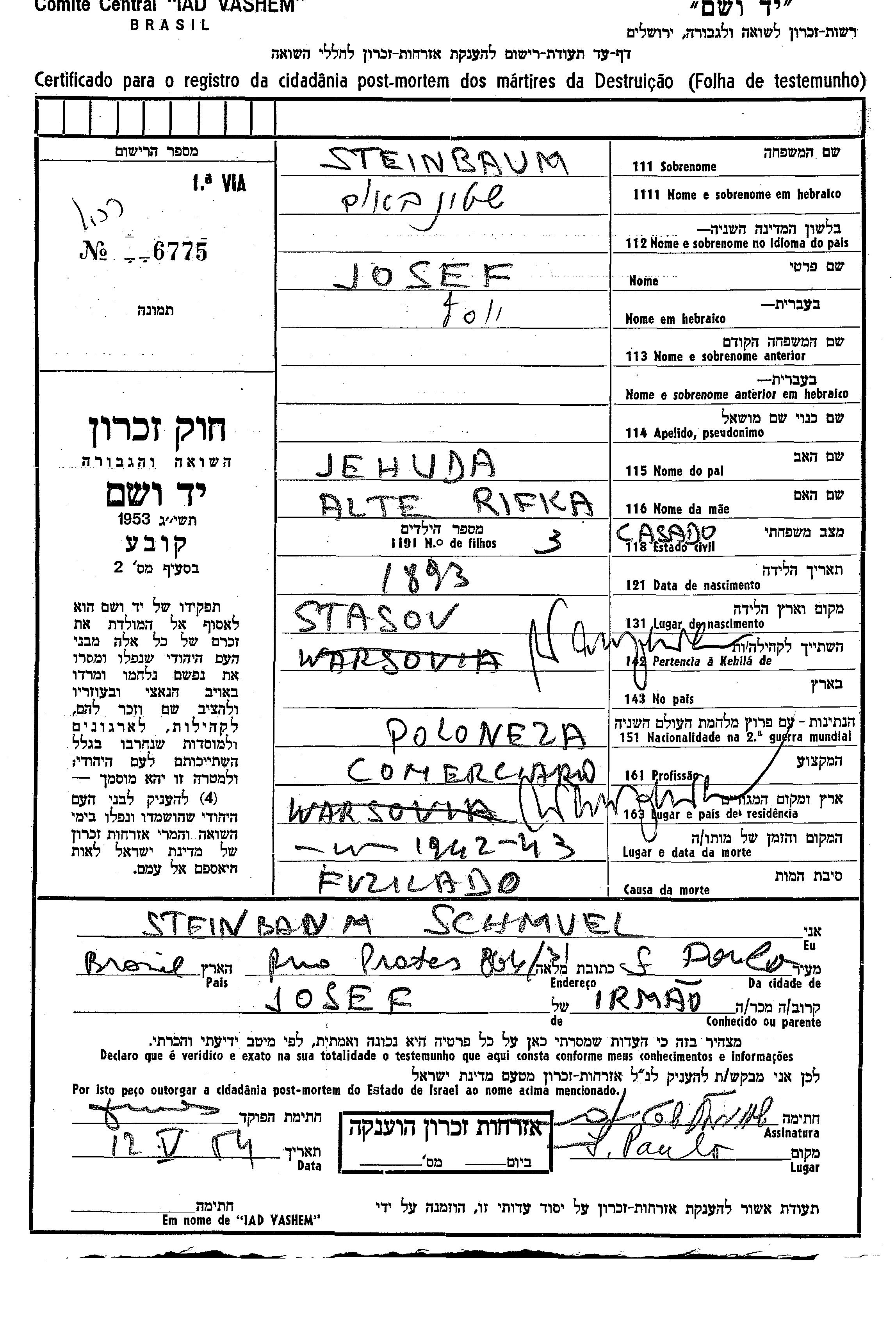 Josef Steinbaum wurde im Jahr 1893 in Stasov, Polen geboren. Er war der Sohn von Jehuda und Rivka Alte. Er war Kaufmann/-frau und Verheiratet. Vor dem Zweiten Weltkrieg lebte er in Warszawa, Polen. Während des Krieges war er in Polen.