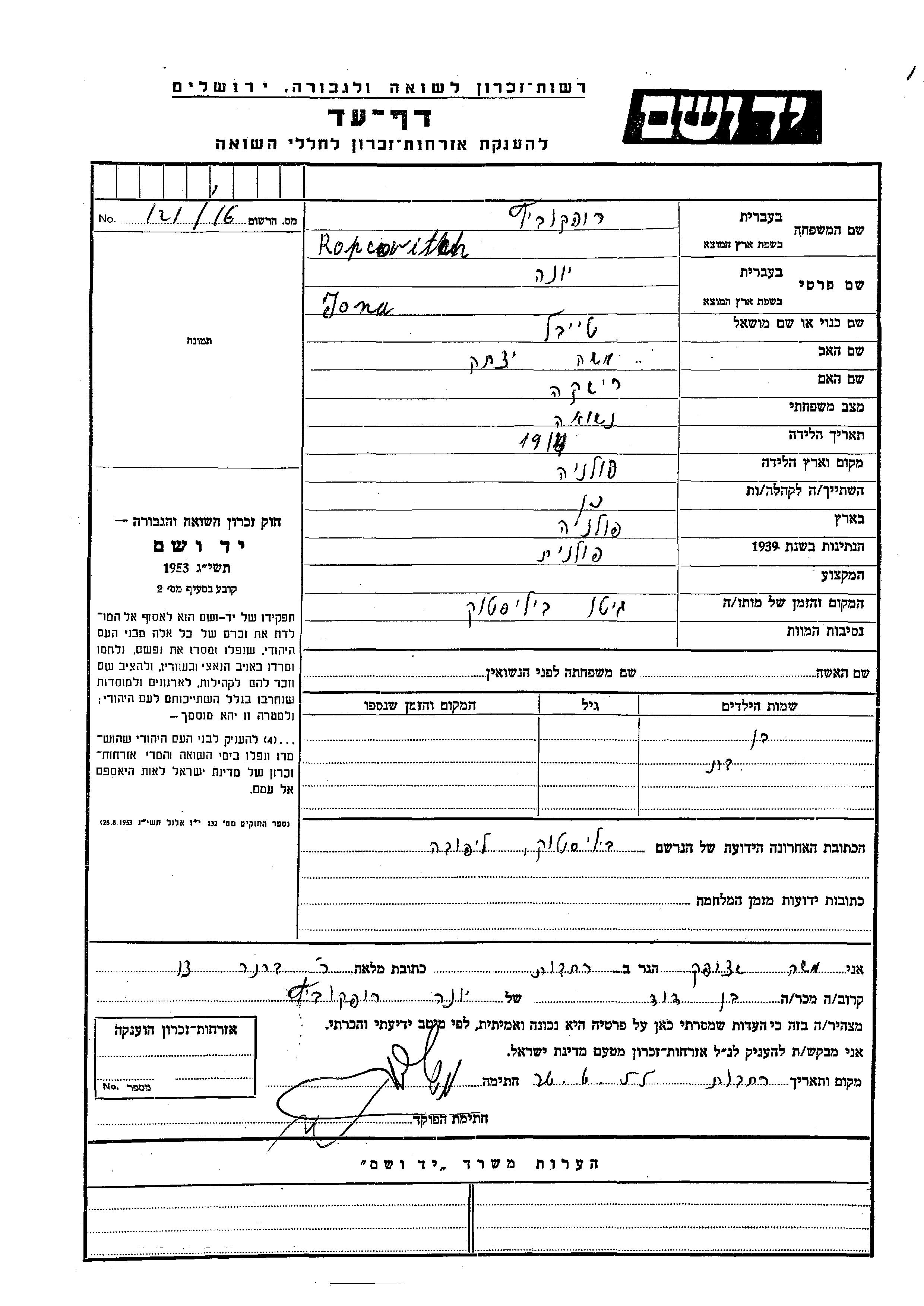 Jona Ropcowitch wurde im Jahr 1914 in Polen geboren. Er war der Sohn von Moshe Yitzkhak und Rishka. Er war Verheiratet. Vor dem Zweiten Weltkrieg lebte er in Polen. Während des Krieges war er in Bialystok, Polen.