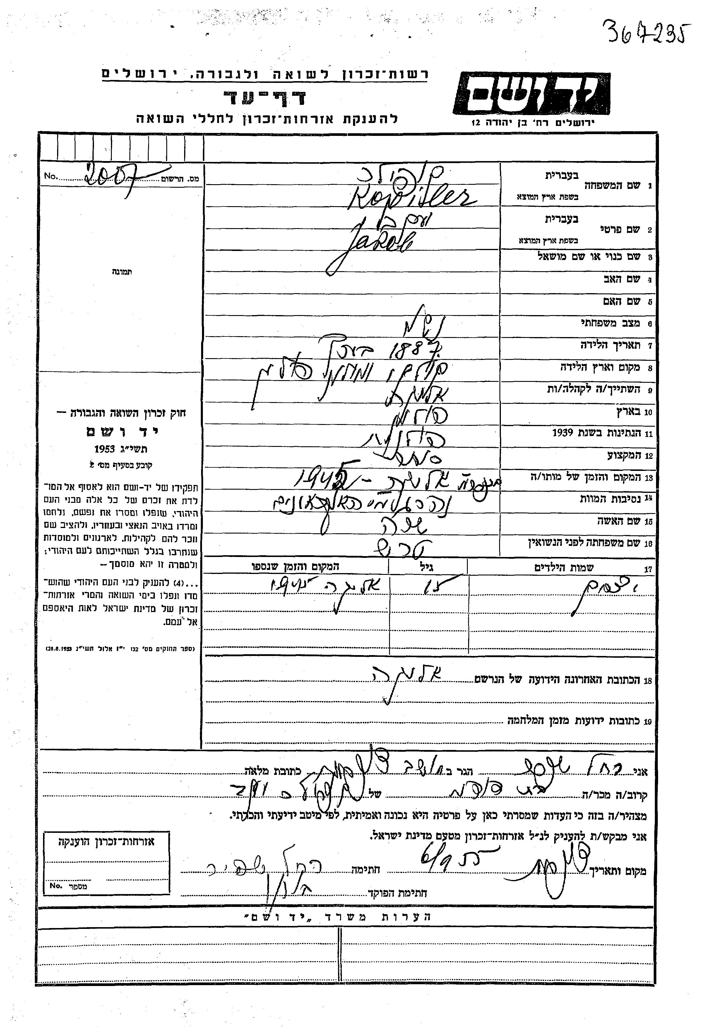 Jakob Kopiler wurde im Jahr 1887 in Kołki, Polen geboren. Er war Kaufmann/-frau und mit Sara, geb. Teresh Verheiratet. Vor dem Zweiten Weltkrieg lebte er in Kołki, Polen. Während des Krieges war er in Alika, Polen.
