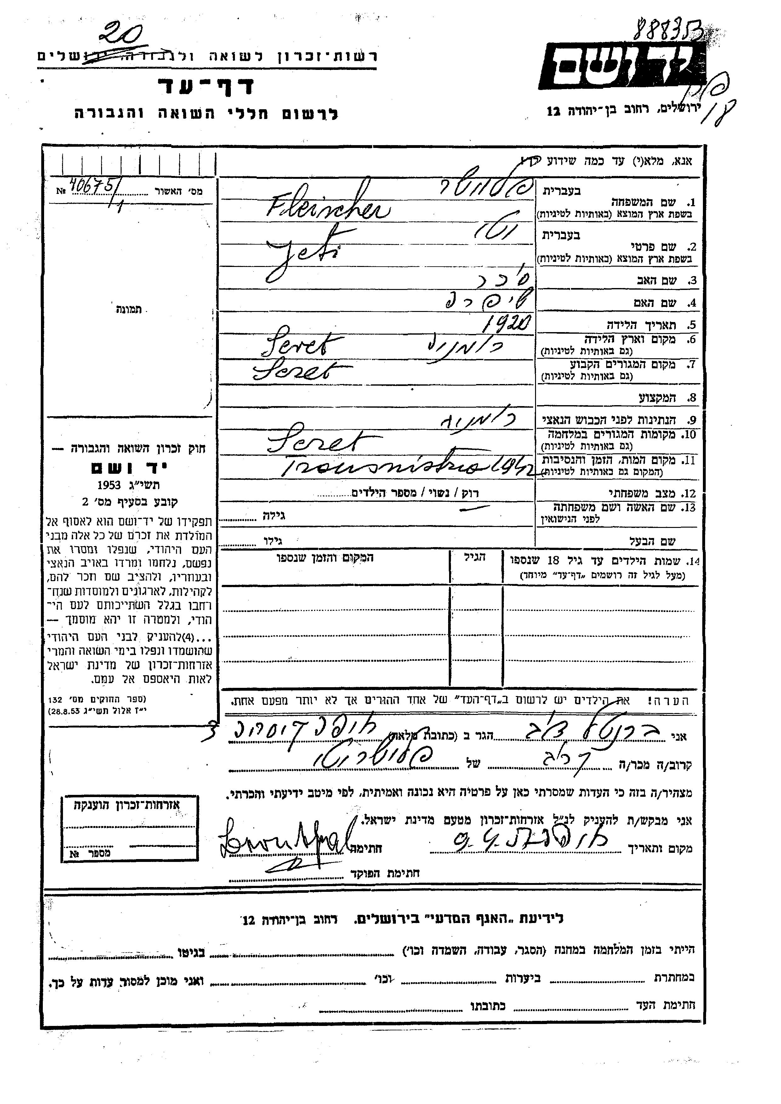 Yeti Fleischer wurde im Jahr 1920 in Siret, Rumänien geboren. Sie war die Tochter von Issakhar und Shifra. Sie war Ledig. Vor dem Zweiten Weltkrieg lebte sie in Siret, Rumänien. Während des Krieges war sie in Siret, Rumänien.