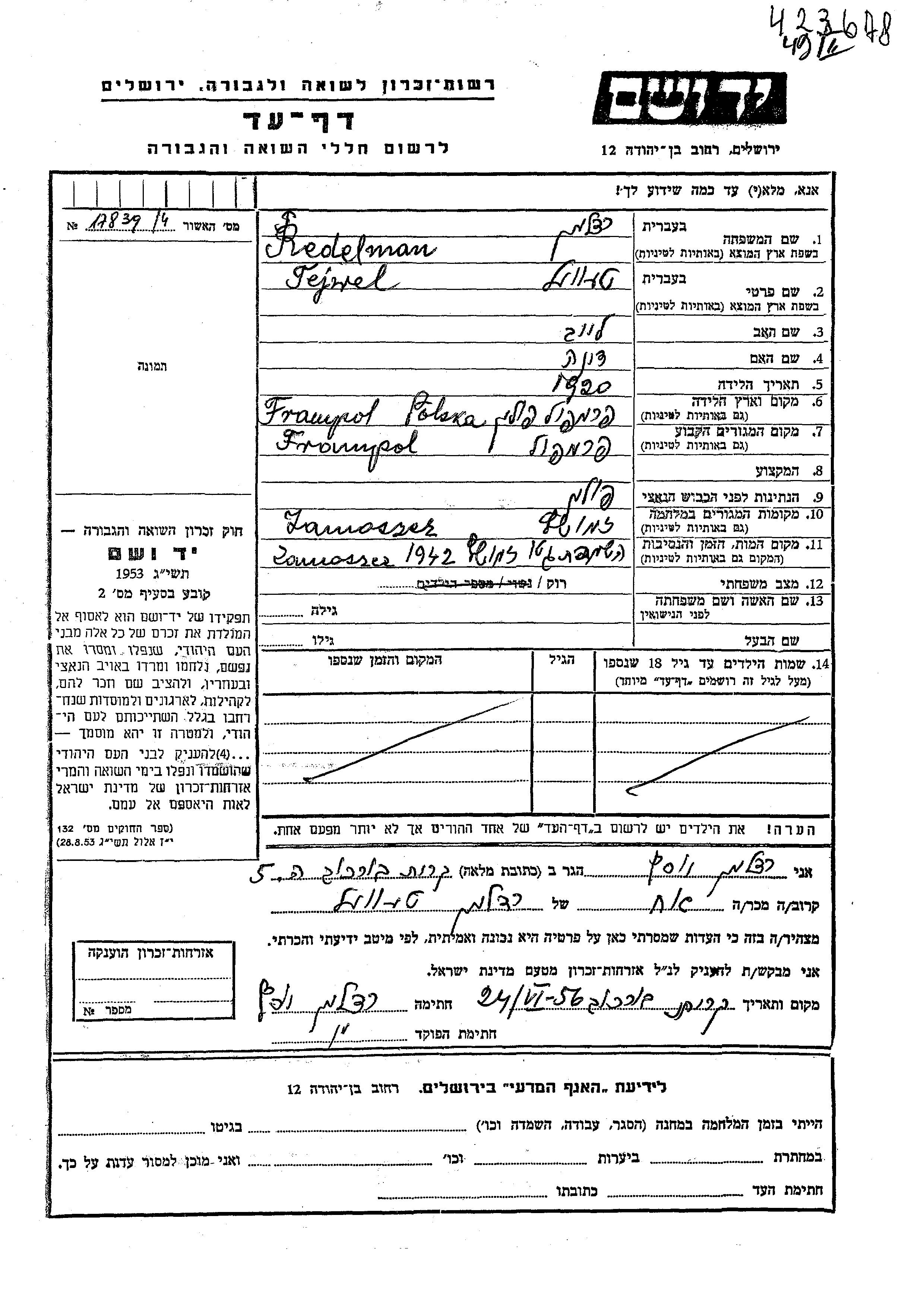 Redelman Fejwel Tuvia 1920 Frampol, Polen Gedenkblatt