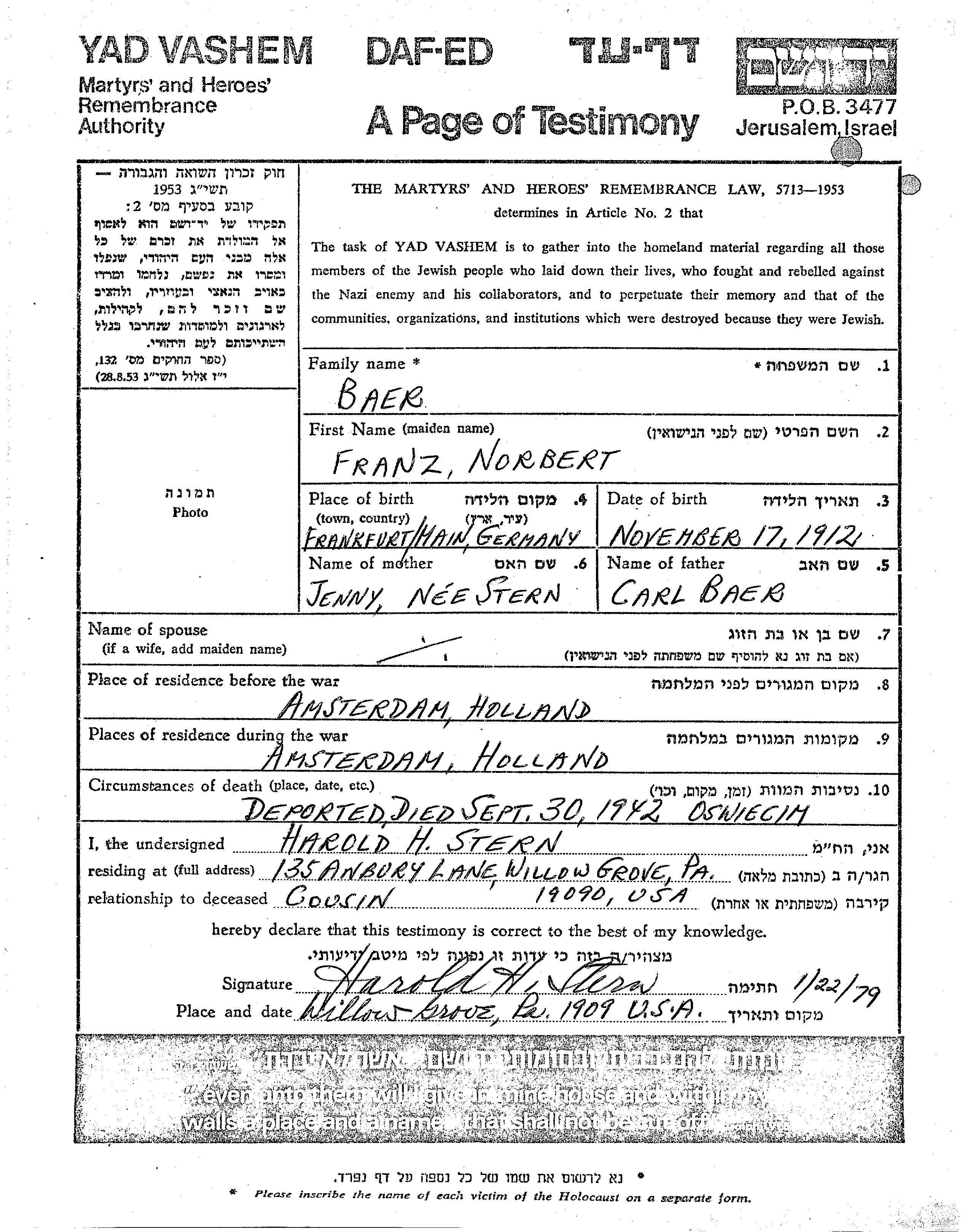 Franz Norbert Bär wurde im Jahr 1912 in Frankfurt, Deutsches Reich geboren. Er war der Sohn von Carl und Jenny. Vor dem Zweiten Weltkrieg lebte er in Amsterdam, Niederlande. Während des Krieges war er in Amsterdam, Niederlande.