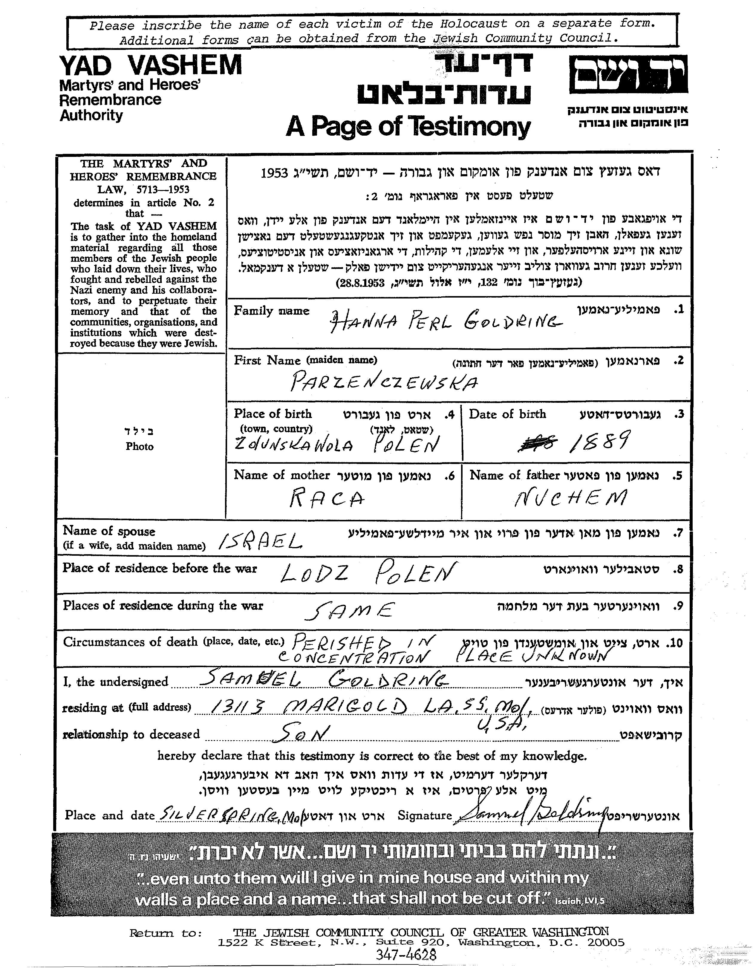 Hanna Perl Goldring, geb. Parzenczewska wurde im Jahr 1889 in Zdunska Vola, Polen geboren. Sie war die Tochter von Nuchem und Raca. Vor dem Zweiten Weltkrieg lebte sie in Lodz, Polen. Während des Krieges war sie in Lodz, Polen.