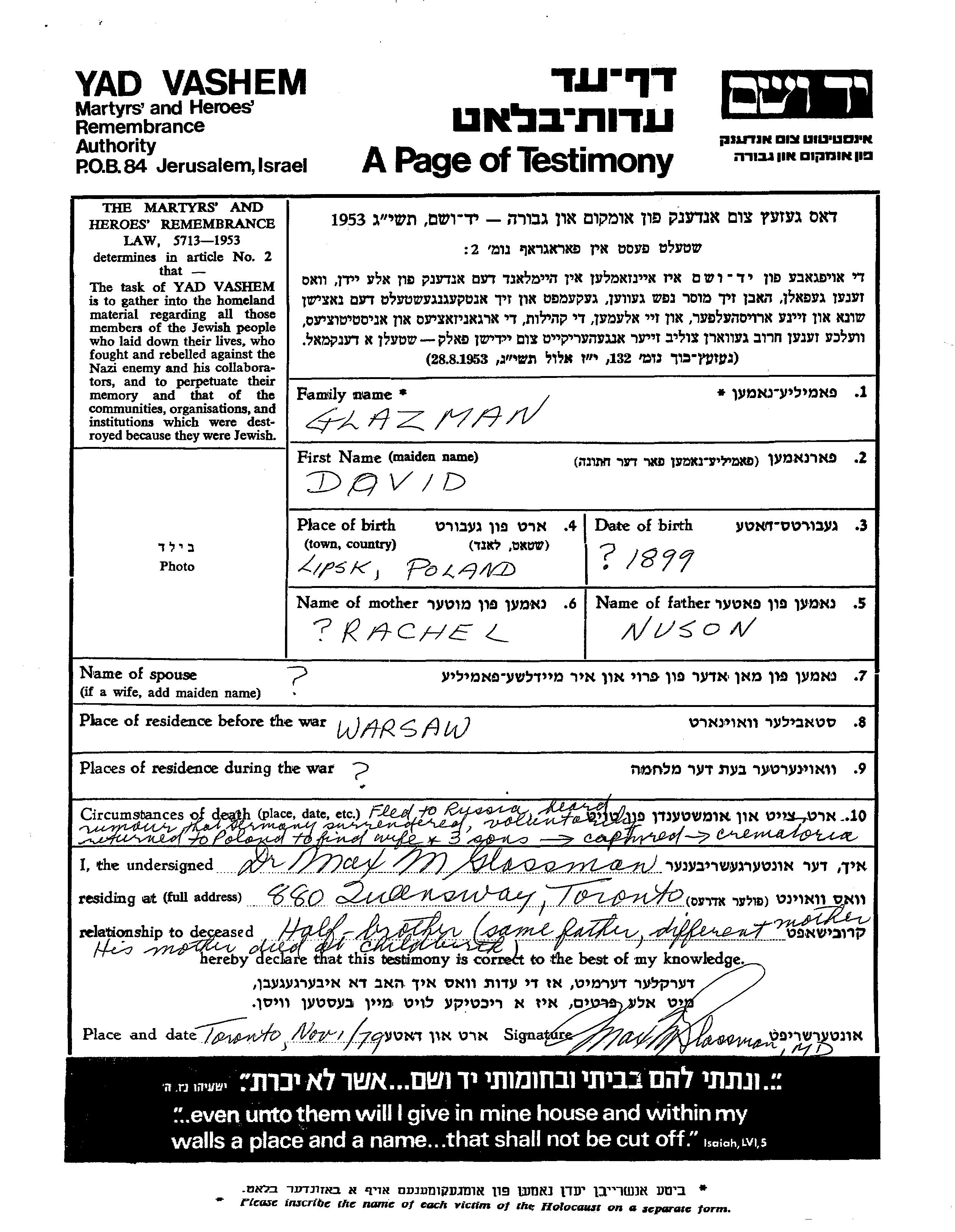 David Glazman wurde im Jahr 1899 in Lipsk, Polen geboren. Er war der Sohn von Nuson und Rachel. Er war Verheiratet. Vor dem Zweiten Weltkrieg lebte er in Warsaw, Polen.