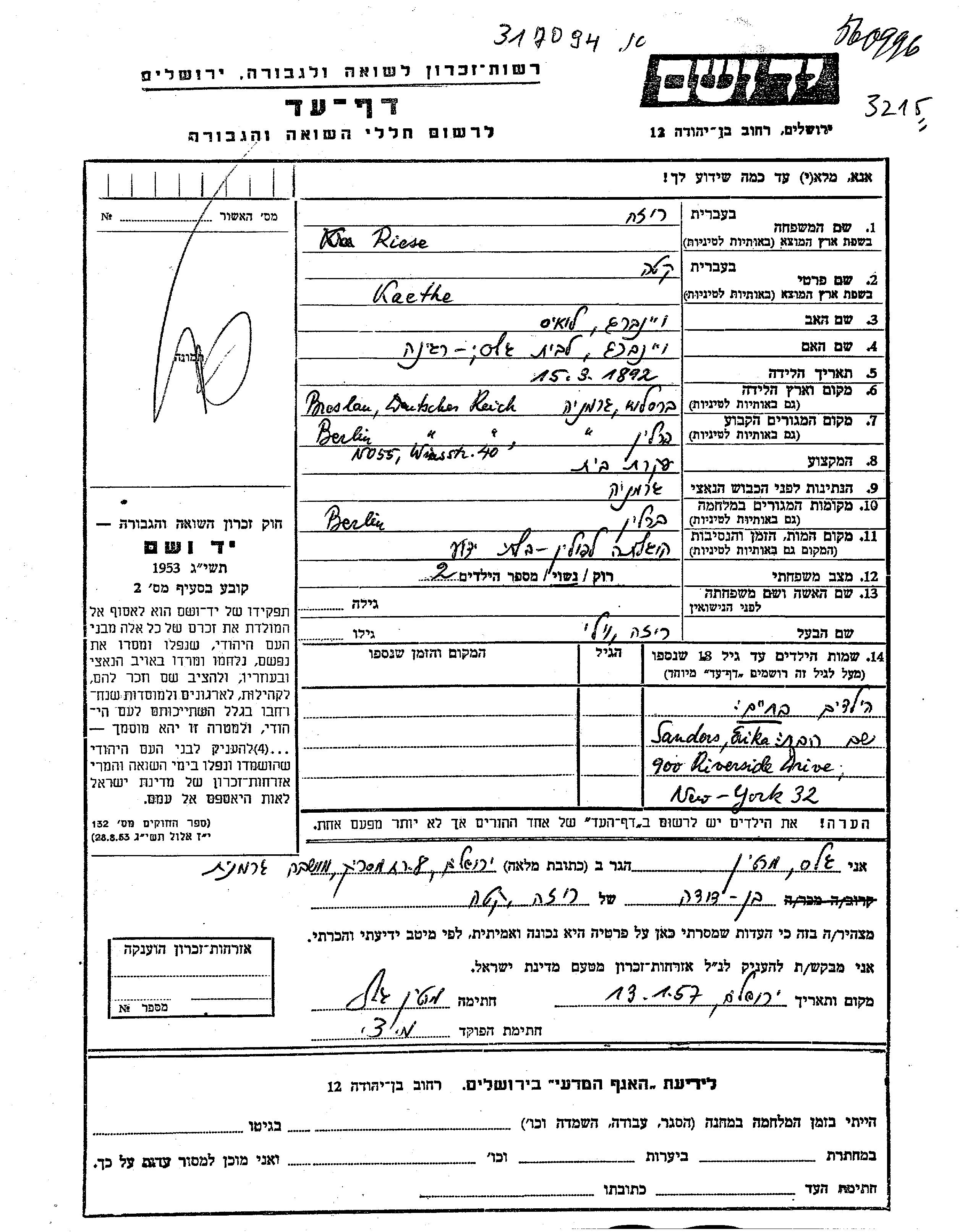 Käthe Riese, geb. Veil wurde im Jahr 1892 in Breslau, Deutsches Reich geboren. Sie war die Tochter von Luis und Regina. Sie war Hausfrau und Verheiratet. Vor dem Zweiten Weltkrieg lebte sie in Berlin, Deutsches Reich. Während des Krieges war sie in Berlin, Deutsches Reich.