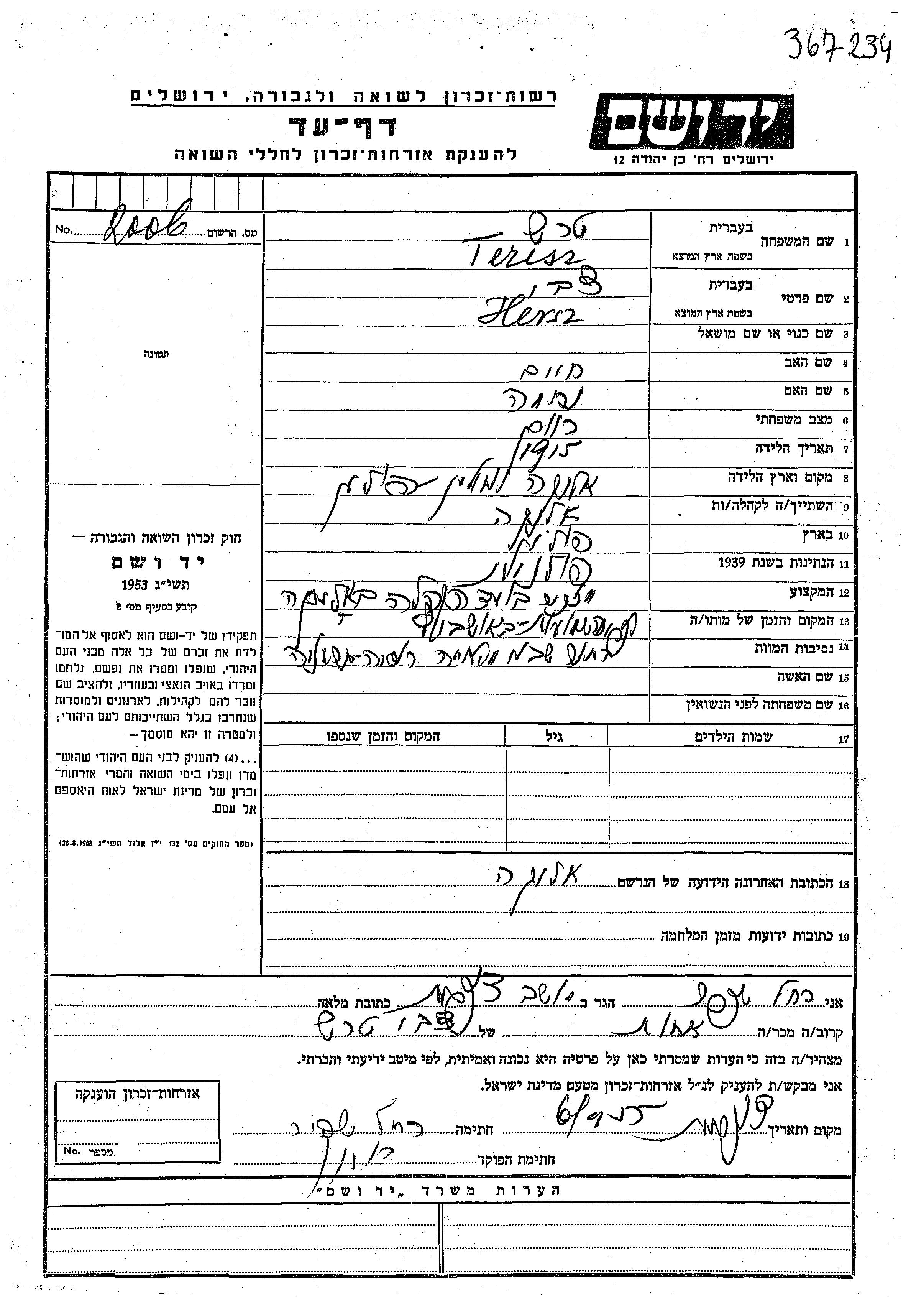 Hersz Tzvi Teresz wurde im Jahr 1915 in Olszana, Polen geboren. Er war der Sohn von Khaim und Nekhama. Er war מזכיר בועד הקהילה und Ledig. Vor dem Zweiten Weltkrieg lebte er in Olszana, Polen. Während des Krieges war er in Olszana, Polen.
