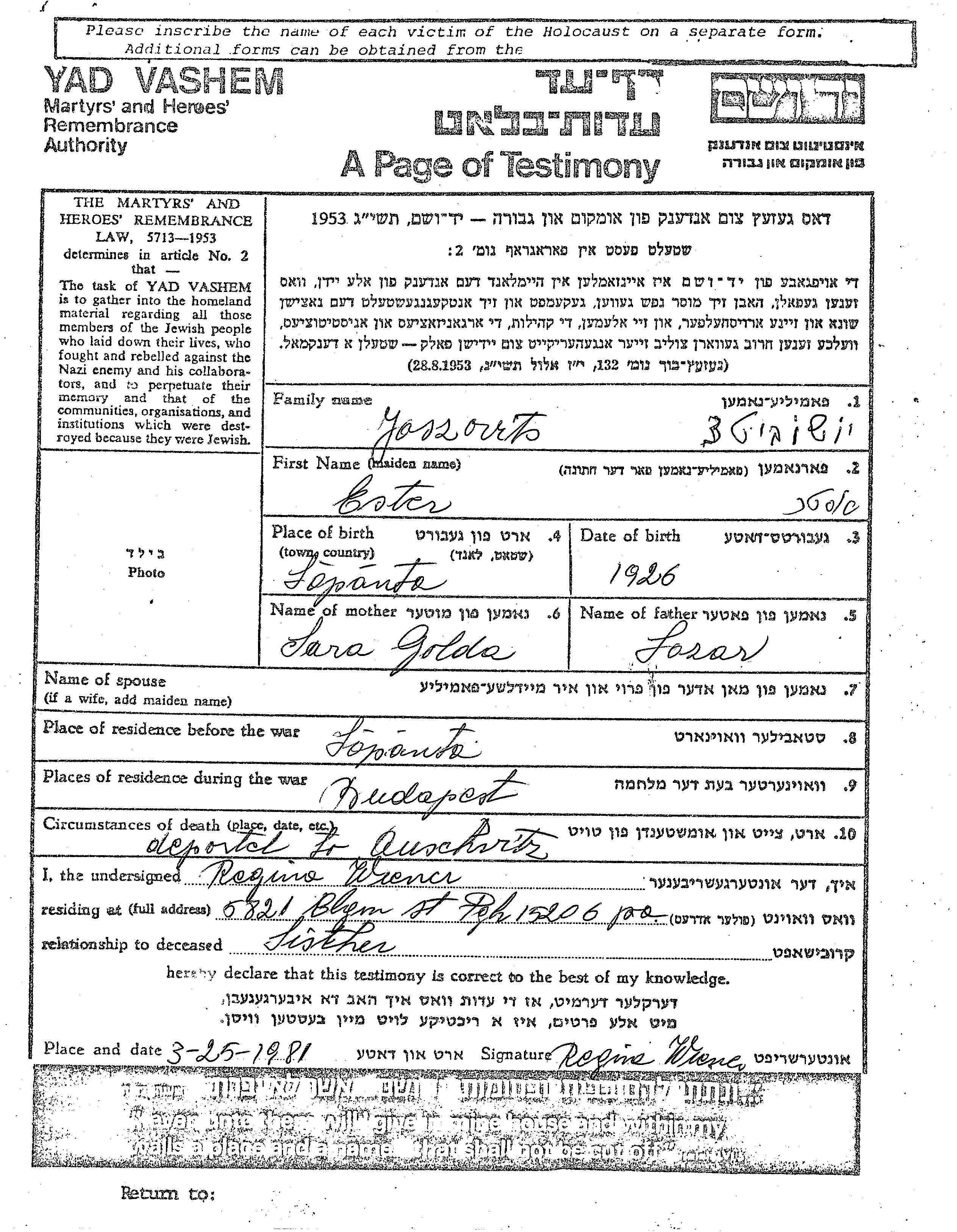 Joszovits Ester 1926 Sapanta, Rumänien Gedenkblatt