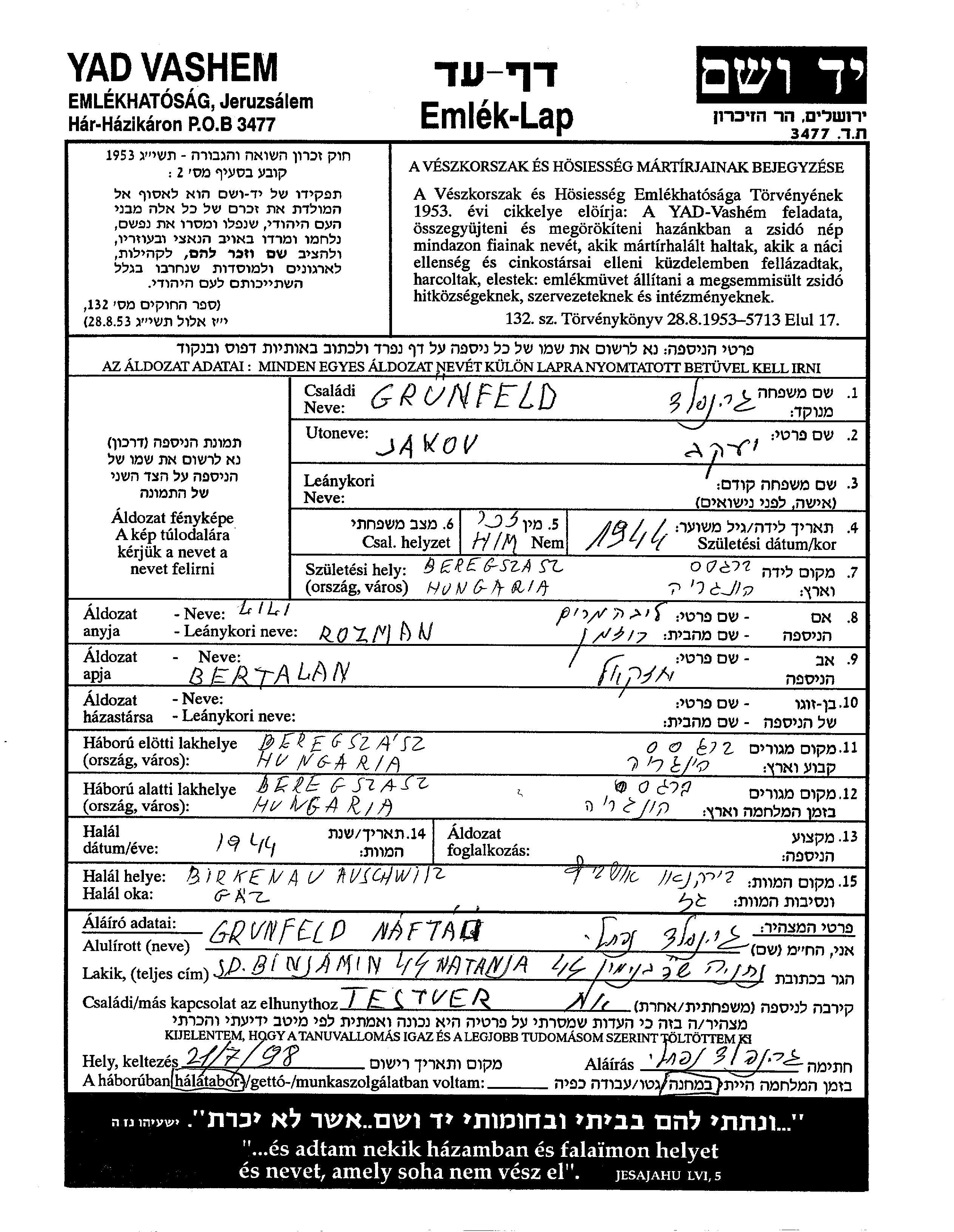 Jakov Grunfeld wurde im Jahr 1944 in Beregszasz, Tschechoslowakei geboren. Er war der Sohn von Bertalan Yekhezkel und Lili Liba Miriam. Vor dem Zweiten Weltkrieg lebte er in Beregszasz, Tschechoslowakei. Während des Krieges war er in Beregszasz, Tschechoslowakei.