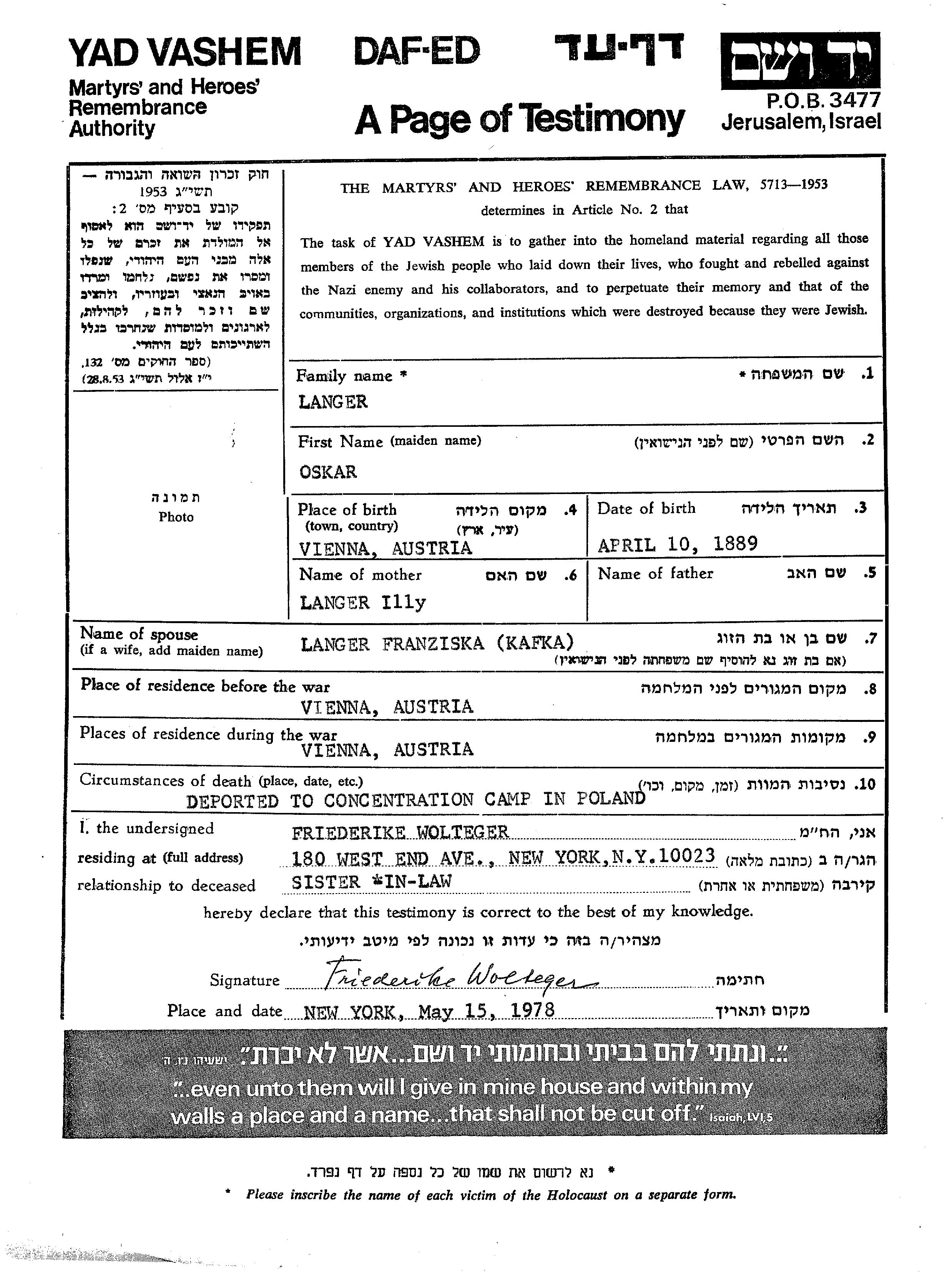 Oskar Langer wurde im Jahr 1889 in Vienna, Österreich geboren. Er war der Sohn von Illy. Er war mit Franziska, geb. Kafka Verheiratet. Vor dem Zweiten Weltkrieg lebte er in Vienna, Österreich. Während des Krieges war er in Vienna, Österreich.