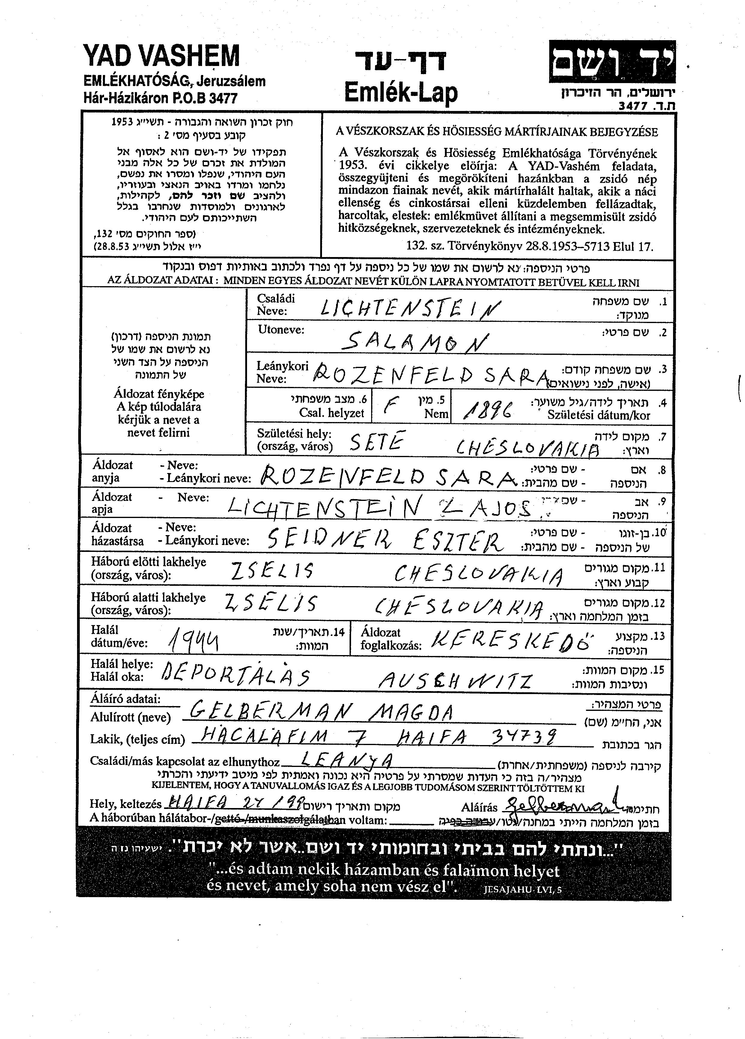 Salamon Lichtenstein wurde im Jahr 1896 in Sete, Frankreich geboren. Er war der Sohn von Lajos und Sara. Er war Kaufmann/-frau und mit Eszter, geb. Seidner Verheiratet. Vor dem Zweiten Weltkrieg lebte er in Tschechoslowakei. Während des Krieges war er in Tschechoslowakei.