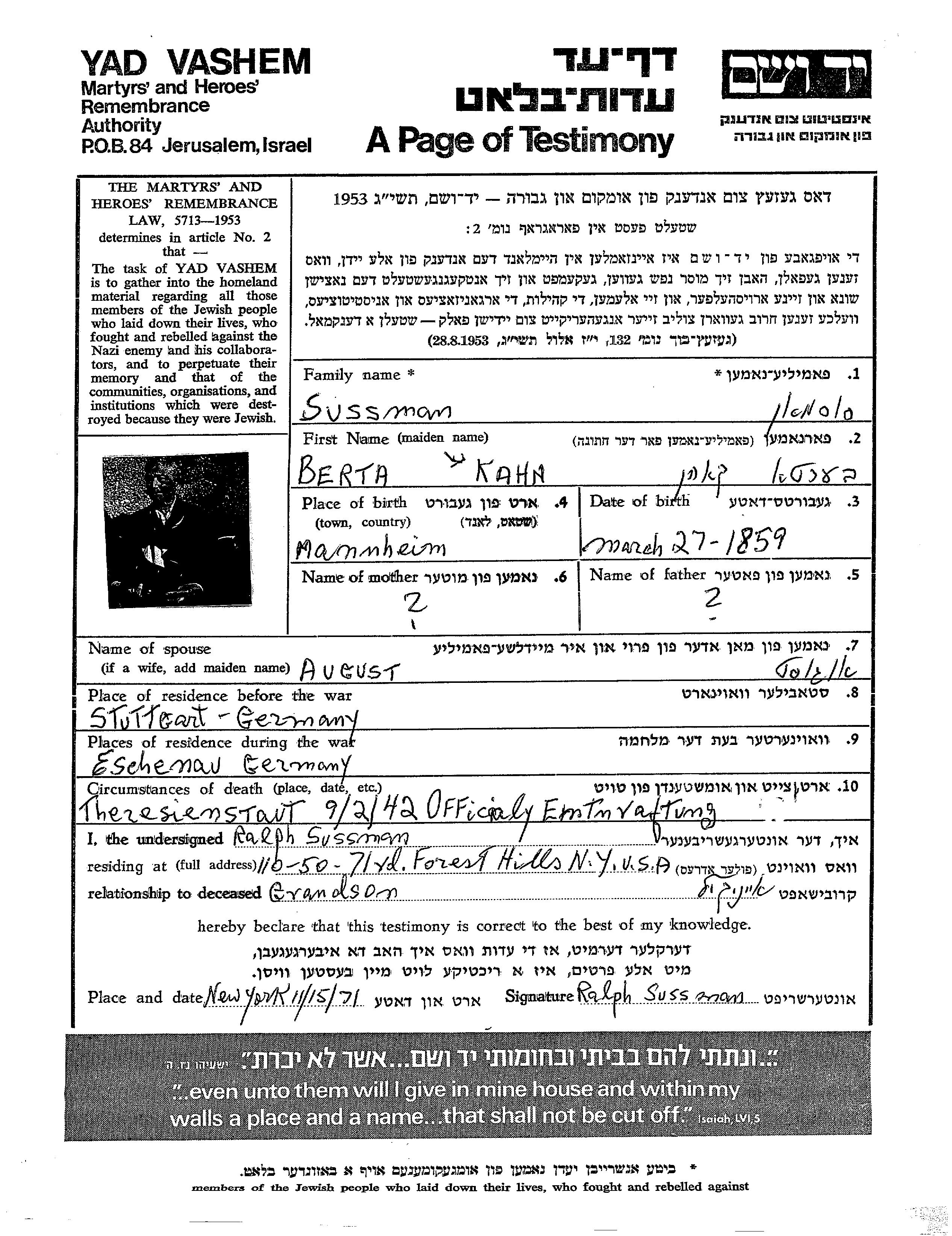 Berta Sussman Sosman, geb. Kahn Kohen wurde im Jahr 1859 in Mannheim, Deutsches Reich geboren. Vor dem Zweiten Weltkrieg lebte sie in Stuttgart, Deutsches Reich. Berta wurde in der Schoah ermordet. Todesort: Terezin, Tschechoslowakei im Jahr 09/02/1942.
