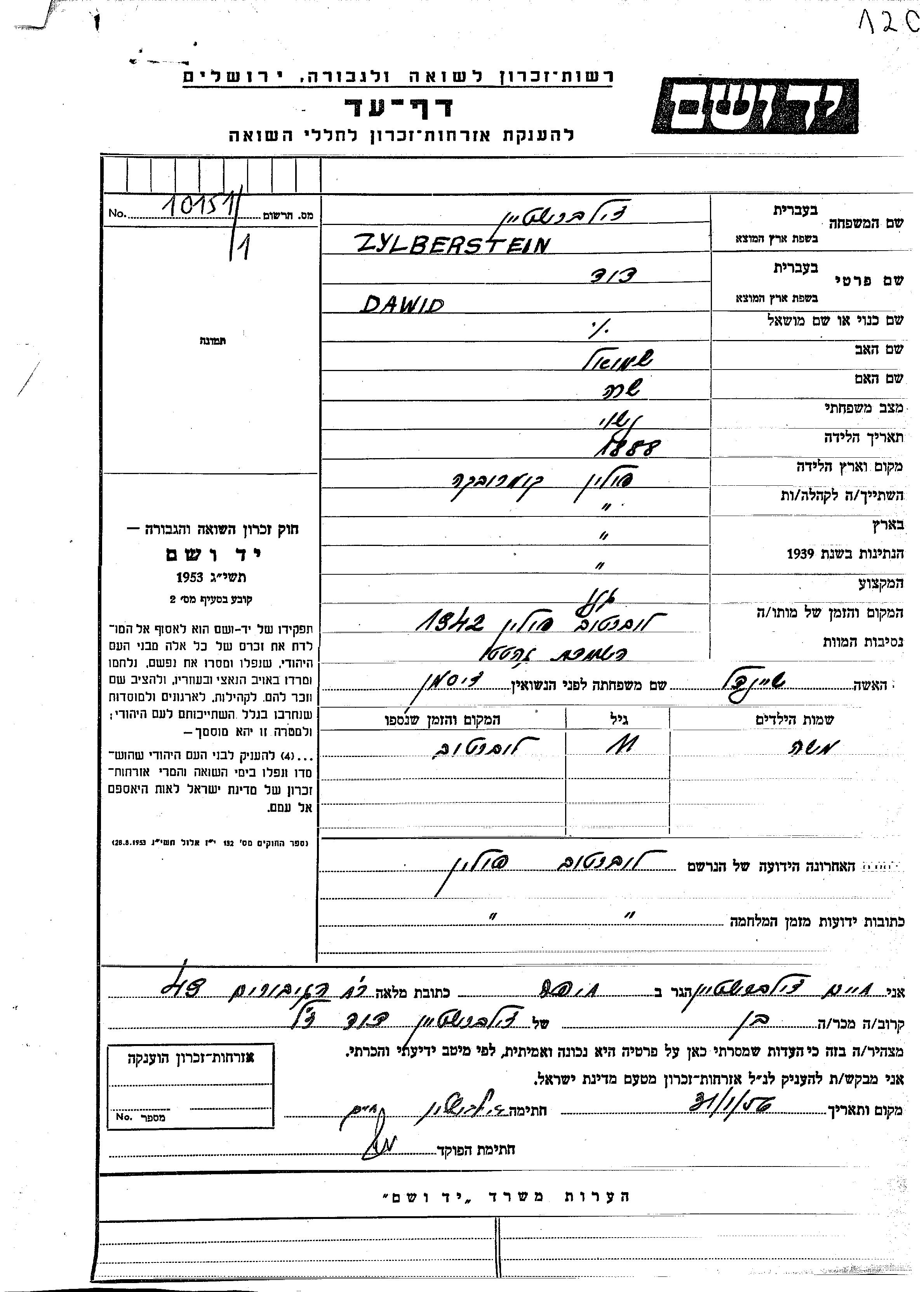 Dawid Zylberstein wurde im Jahr 1888 in Komarówka, Polen geboren. Er war der Sohn von Shmuel und Sara. Er war Gärtner und mit Sheindl, geb. Zisman Verheiratet. Vor dem Zweiten Weltkrieg lebte er in Komarówka, Polen. Während des Krieges war er in Komarówka, Polen.