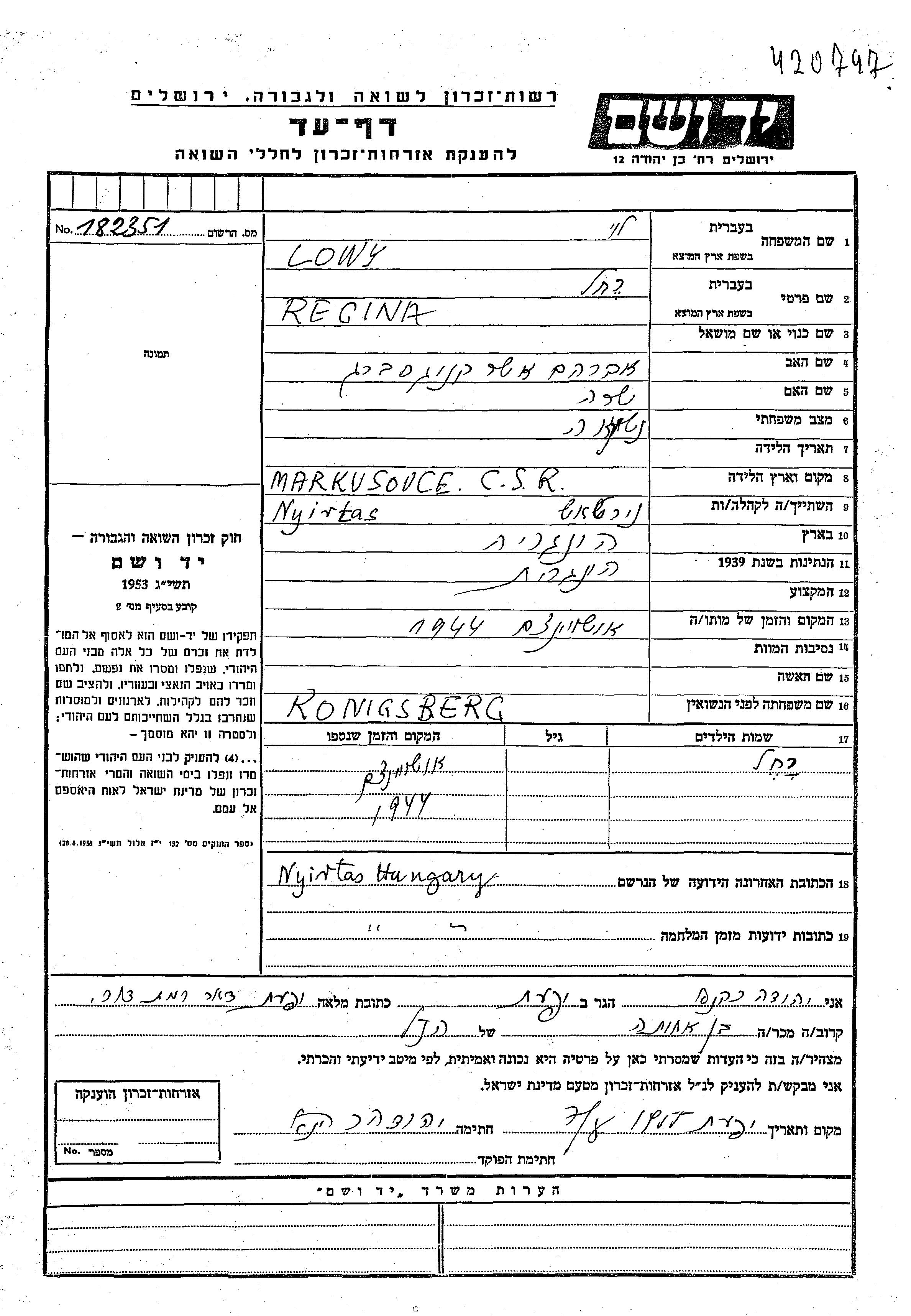 Regina Rakhel Lowy, geb. Konigsberg wurde in Markusovce, Tschechoslowakei geboren. Sie war die Tochter von Avraham Asher und Sara. Sie war Verheiratet. Vor dem Zweiten Weltkrieg lebte sie in Nyirtass, Ungarn. Während des Krieges war sie in Nyirtass, Ungarn.