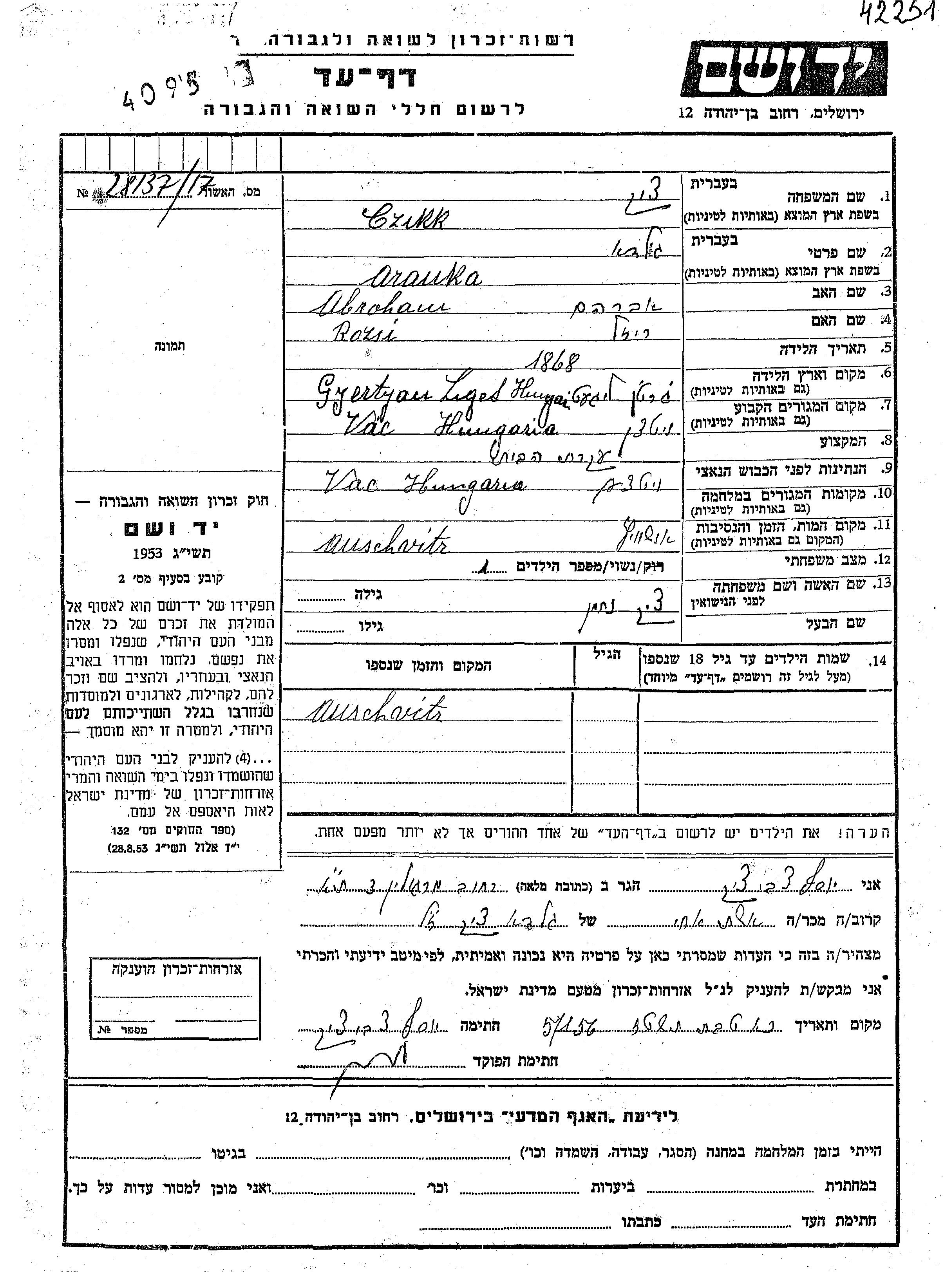 Golda Aranka Czikk wurde im Jahr 1868 in Gyertyanliget, Tschechoslowakei geboren. Sie war die Tochter von Abraham und Rozsi. Sie war Hausfrau und mit Nakhman Verheiratet. Vor dem Zweiten Weltkrieg lebte sie in Vac, Ungarn.