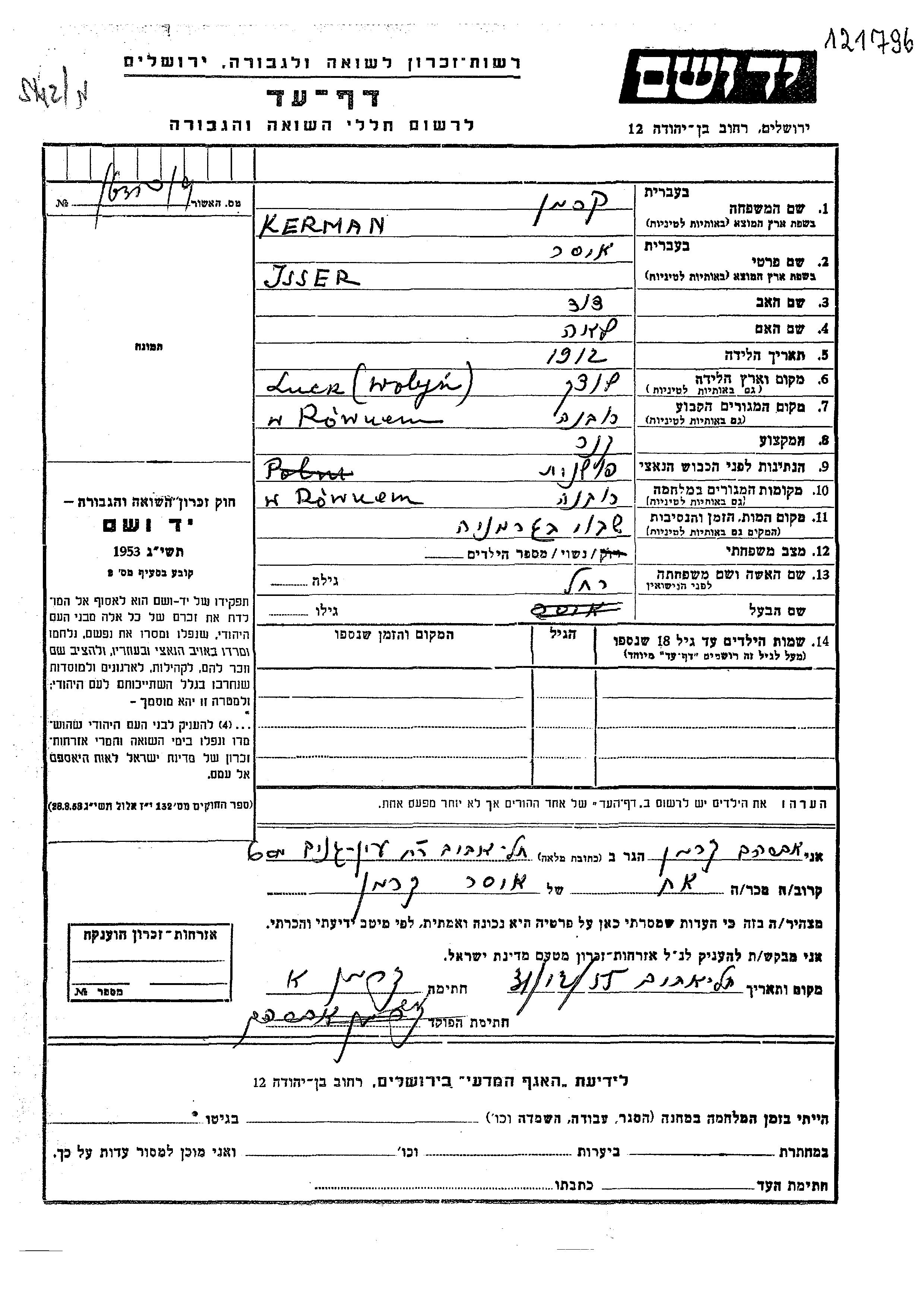 Jsser Kerman wurde im Jahr 1912 in Luck, Polen geboren. Er war der Sohn von David und Lea. Er war Geiger und mit Rakhel Verheiratet. Vor dem Zweiten Weltkrieg lebte er in Rowno, Polen. Während des Krieges war er in Rowno, Polen.