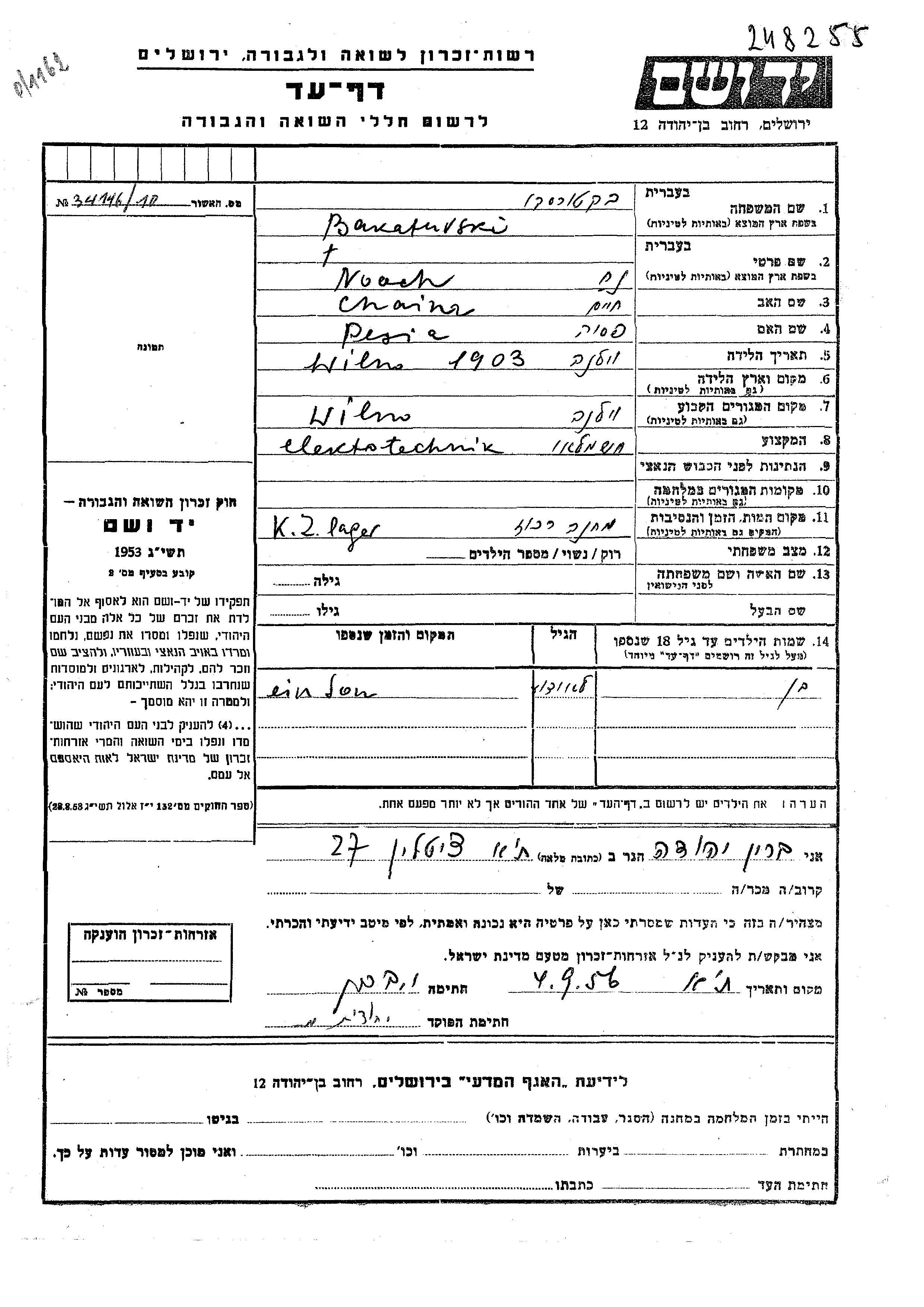 Noach Bakaturski wurde im Jahr 1903 in Wilno, Polen geboren. Er war der Sohn von Chaiim und Peisia. Er war Elektriker/-in und Verheiratet. Vor dem Zweiten Weltkrieg lebte er in Wilno, Polen.