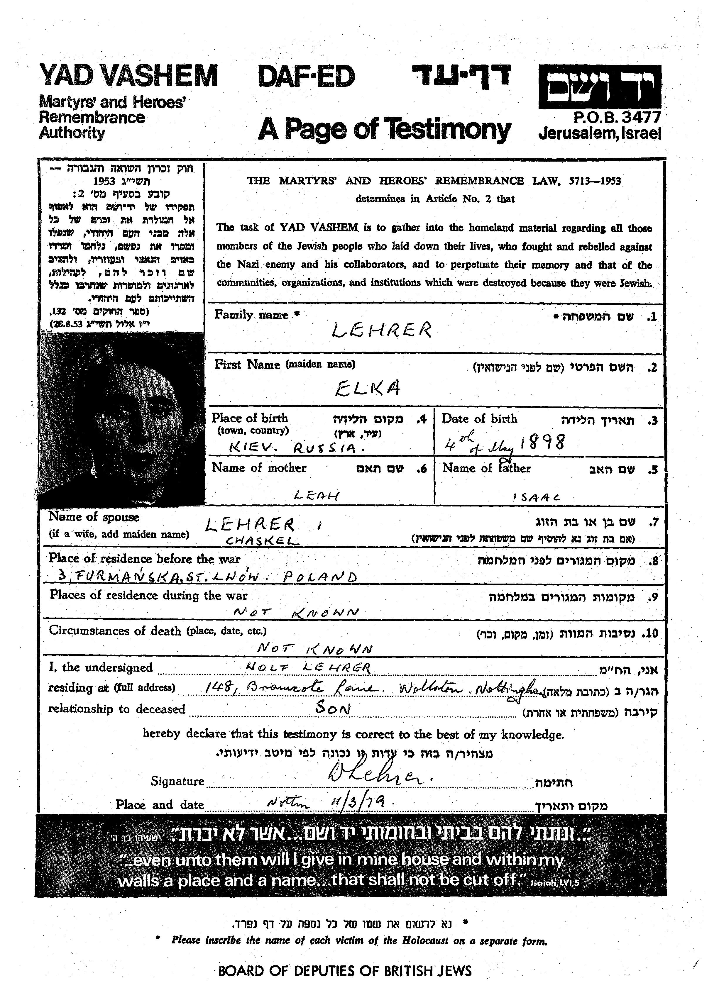 Elka Lehrer wurde im Jahr 1898 in Kiev, Ukraine (UdSSR) geboren. Sie war die Tochter von Isaac und Leah. Sie war mit Chaskel Verheiratet. Vor dem Zweiten Weltkrieg lebte sie in Lwow, Polen.