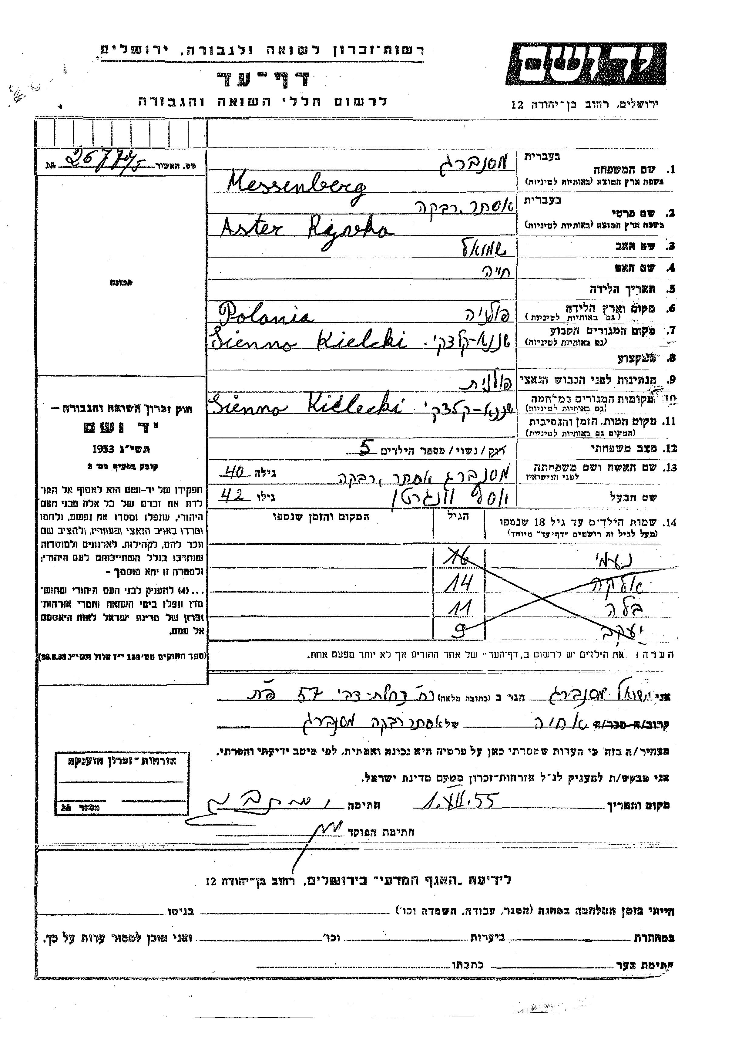 Ester Ryvka Veingarten, geb. Messenberg wurde in Polen geboren. Sie war die Tochter von Shmuel und Khaia. Sie war mit Yosef Verheiratet. Vor dem Zweiten Weltkrieg lebte sie in Sienno, Polen. Während des Krieges war sie in Sienno, Polen.