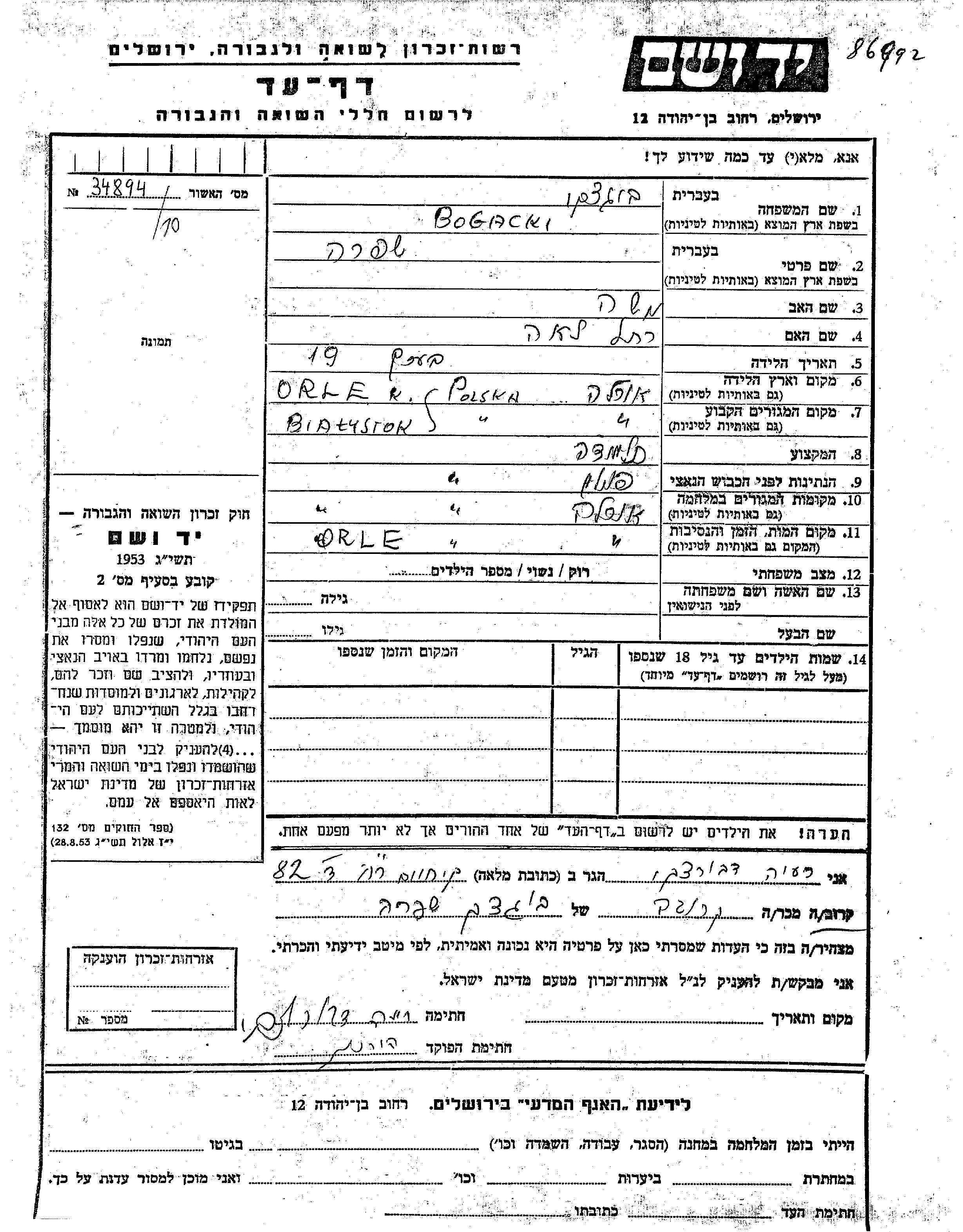 Shifra Bogacki wurde in Orle, Polen geboren. Sie war die Tochter von Moshe und Rakhel Lea. Sie war Schüler/-in. Vor dem Zweiten Weltkrieg lebte sie in Bialystok, Polen. Während des Krieges war sie in Orle, Polen.