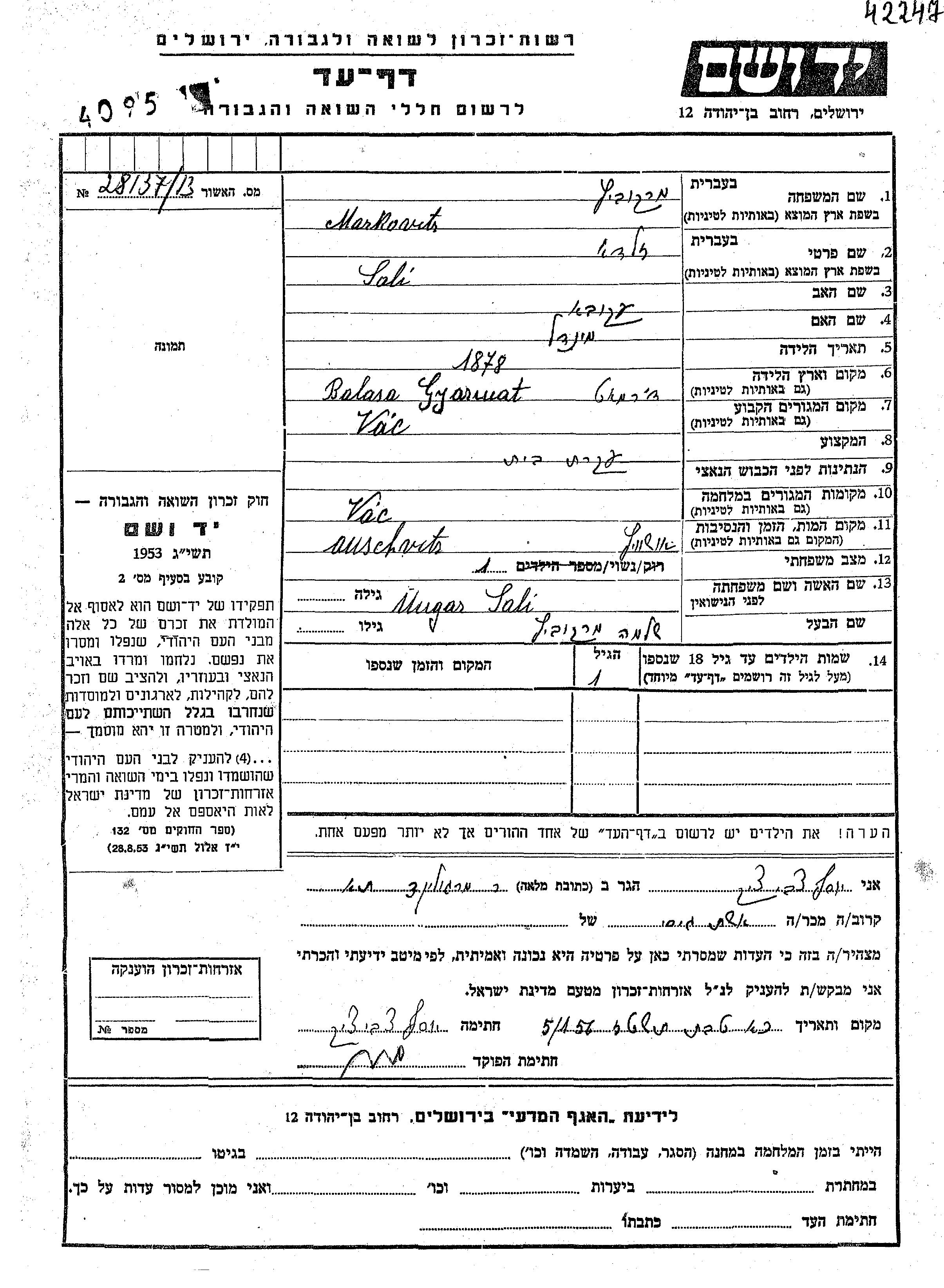 Zelda Sali Markovits, geb. Ungar wurde im Jahr 1878 in Balasagyarmat, Ungarn geboren. Sie war die Tochter von Akiva und Mindl. Sie war Hausfrau und mit Shlomo Verheiratet. Vor dem Zweiten Weltkrieg lebte sie in Vac, Ungarn. Während des Krieges war sie in Vac, Ungarn.
