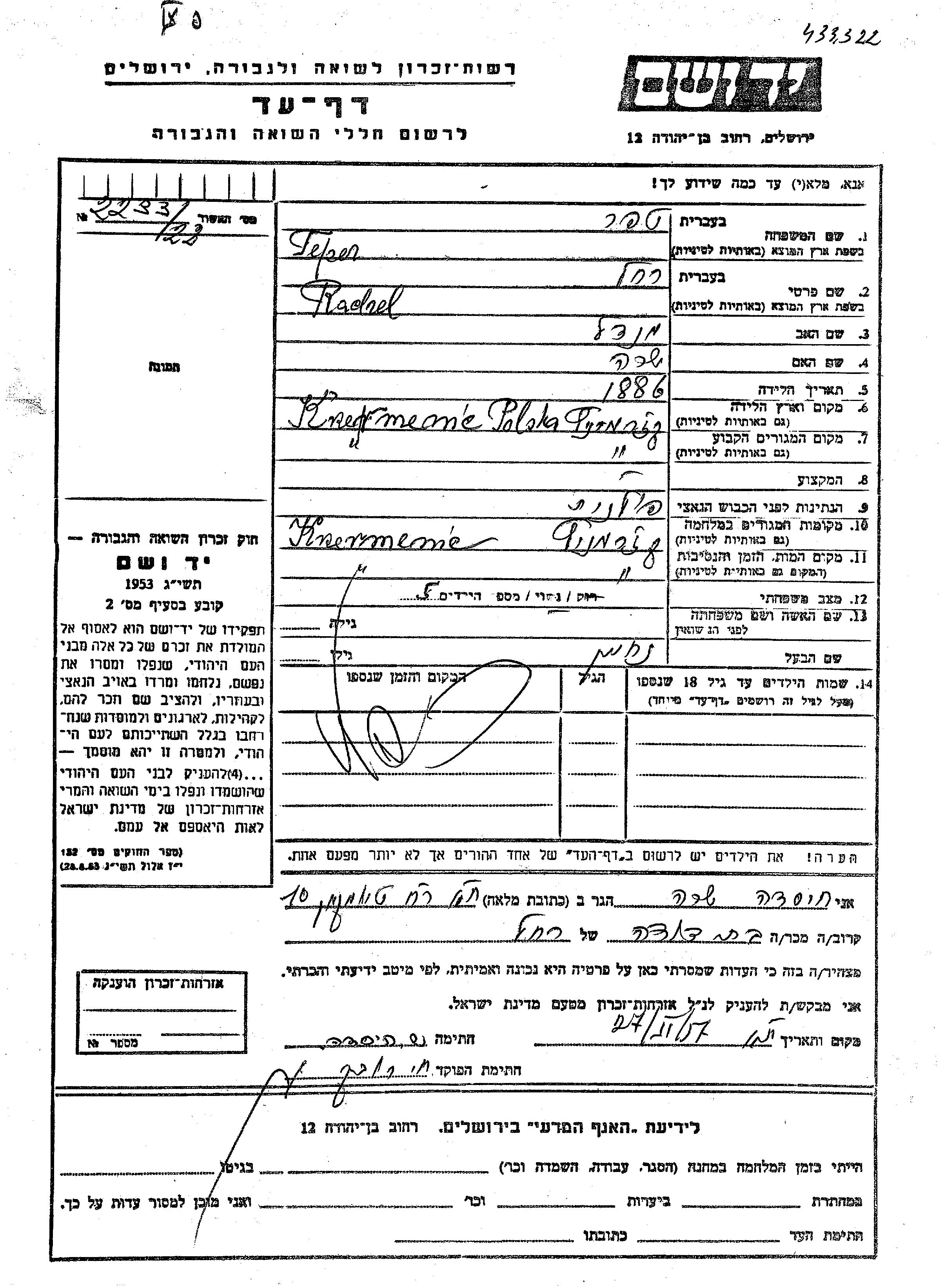 Rachel Teper wurde im Jahr 1886 in Krzemieniec, Polen geboren. Sie war die Tochter von Mendel und Sara. Sie war mit Nakhman Verheiratet. Vor dem Zweiten Weltkrieg lebte sie in Krzemieniec, Polen. Während des Krieges war sie in Krzemieniec, Polen.