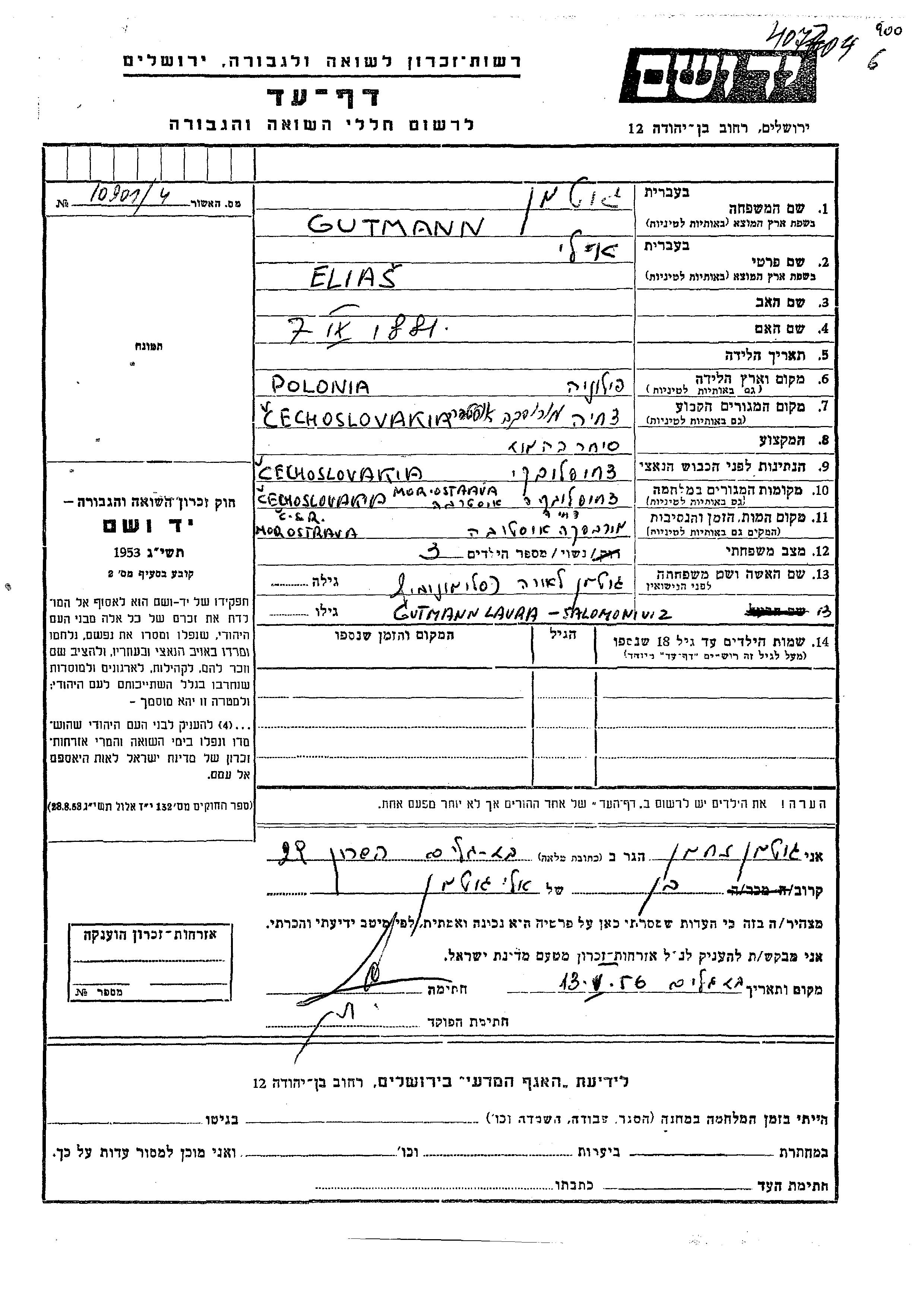 Elias Gutmann wurde im Jahr 1881 in Polen geboren. Er war Viehhändler und mit Laura, geb. Salomoniviz Verheiratet. Vor dem Zweiten Weltkrieg lebte er in Moravska Ostrava, Tschechoslowakei. Während des Krieges war er in Moravska Ostrava, Tschechoslowakei.