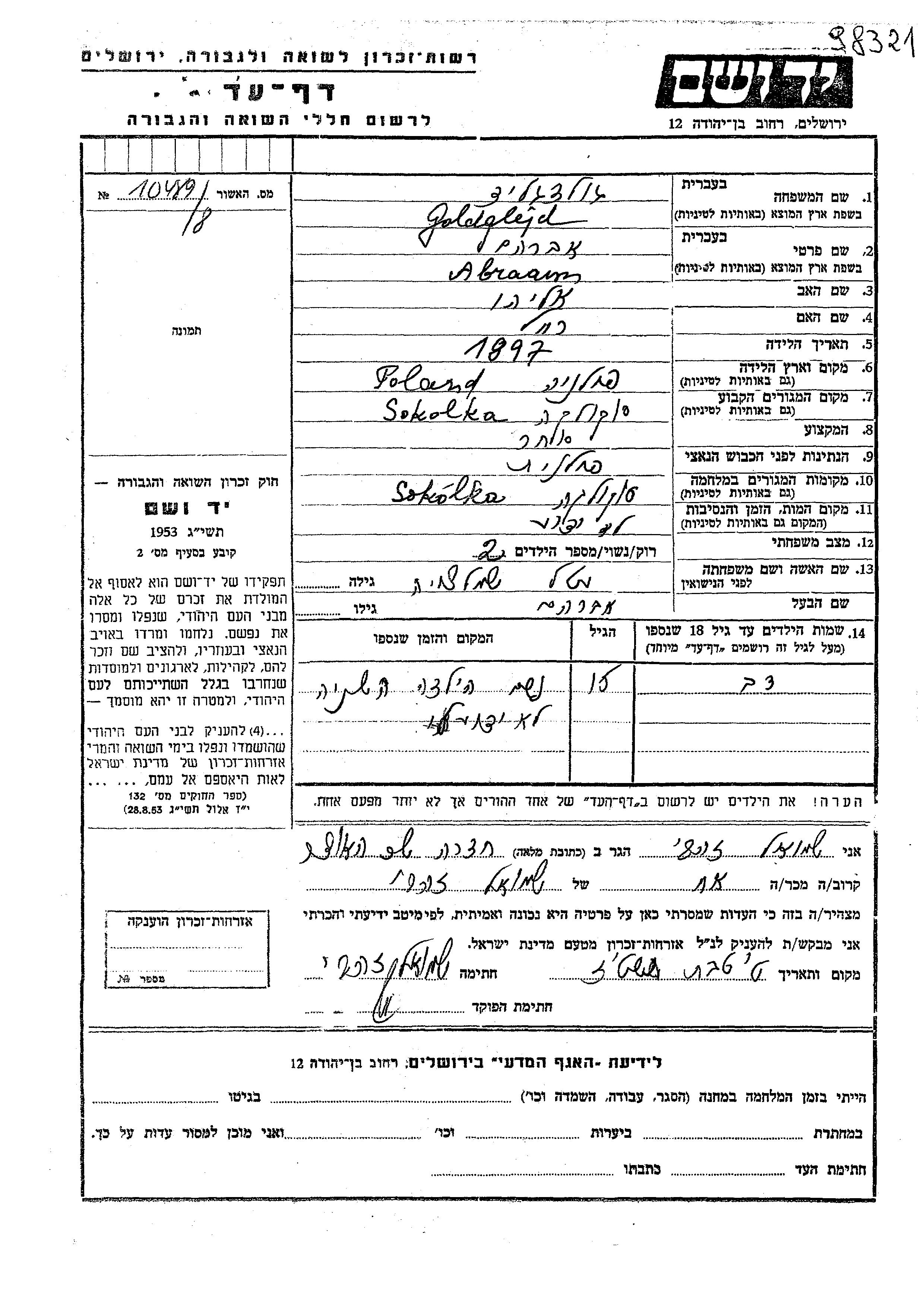 Abraam Goldgleid wurde im Jahr 1897 in Polen geboren. Er war der Sohn von Eliahu und Rakhel. Er war Kaufmann/-frau und mit Etel Verheiratet. Vor dem Zweiten Weltkrieg lebte er in Sokolka, Polen. Während des Krieges war er in Sokolka, Polen.
