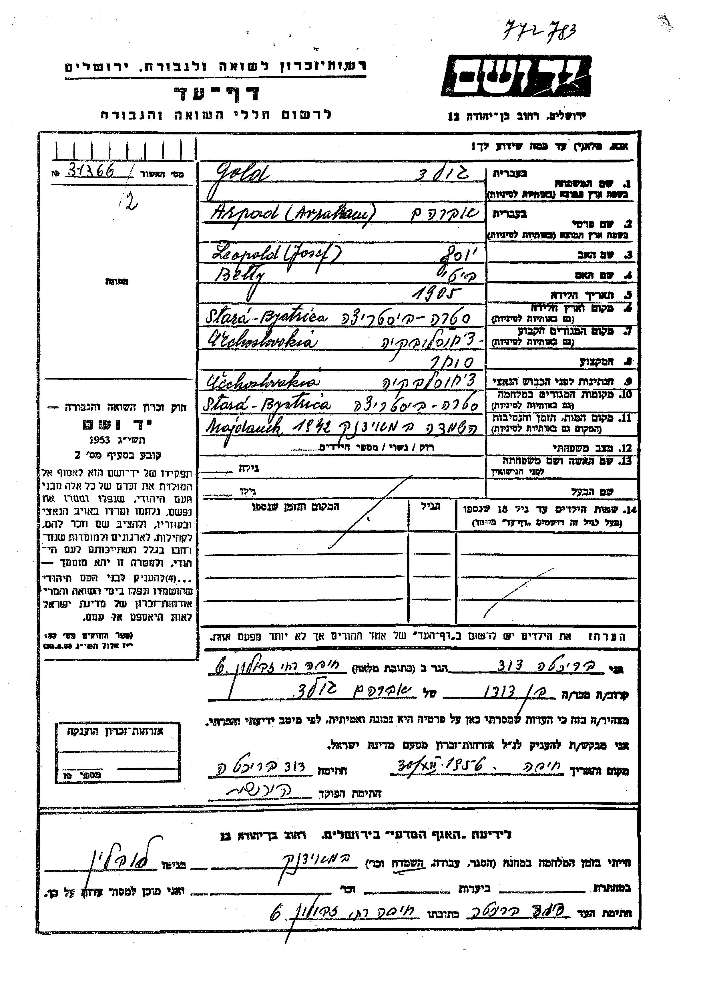 Arpad Avraham Gold wurde im Jahr 1905 in Stara Bystrica, Tschechoslowakei geboren. Er war der Sohn von Josef und Betty. Er war Kaufmann/-frau. Vor dem Zweiten Weltkrieg lebte er in Tschechoslowakei. Während des Krieges war er in Stara Bystrica, Tschechoslowakei.