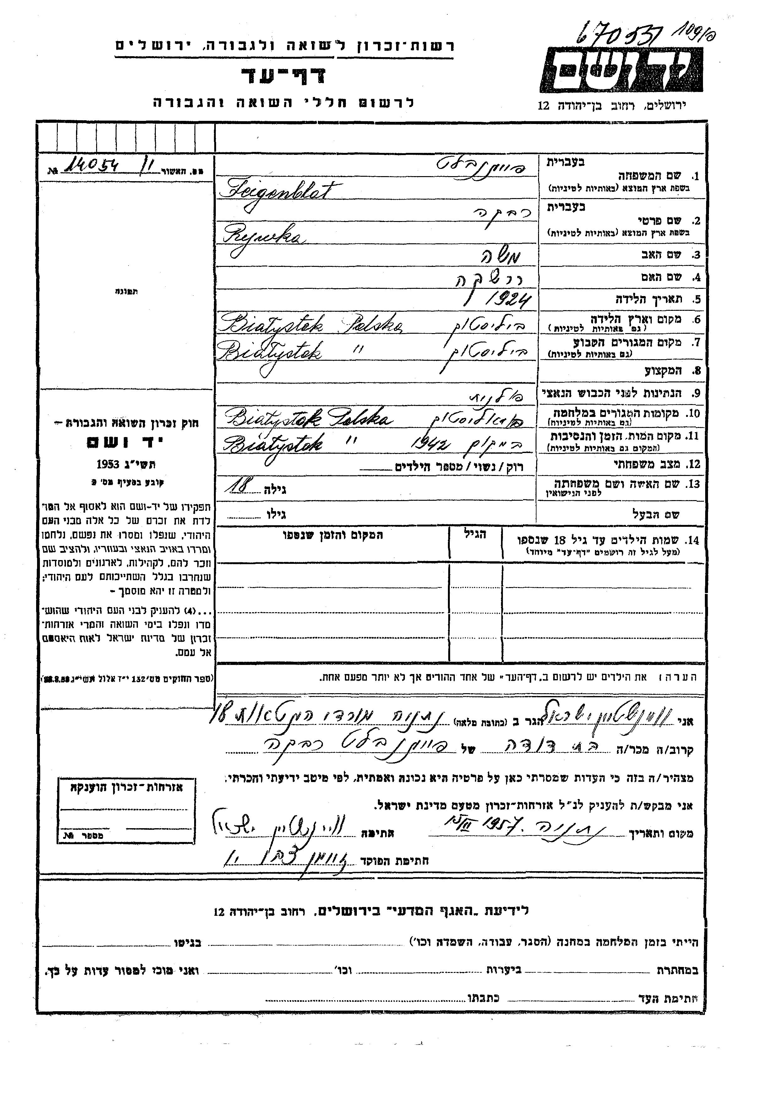 Feinblat Rivka 1924 Bialystok, Polen Gedenkblatt