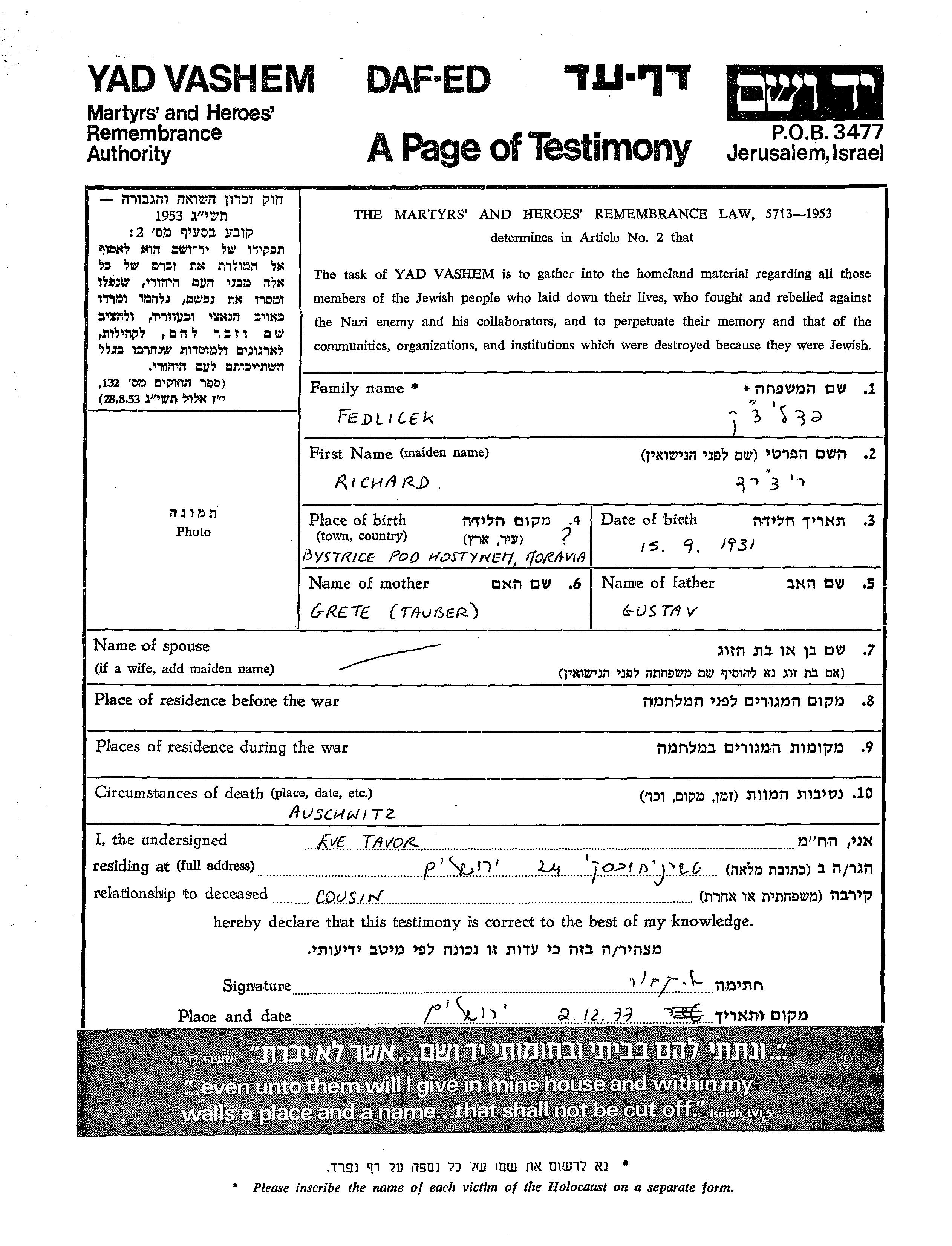 Richard wurde in der Schoah ermordet. Todesort: Auschwitz, Polen.