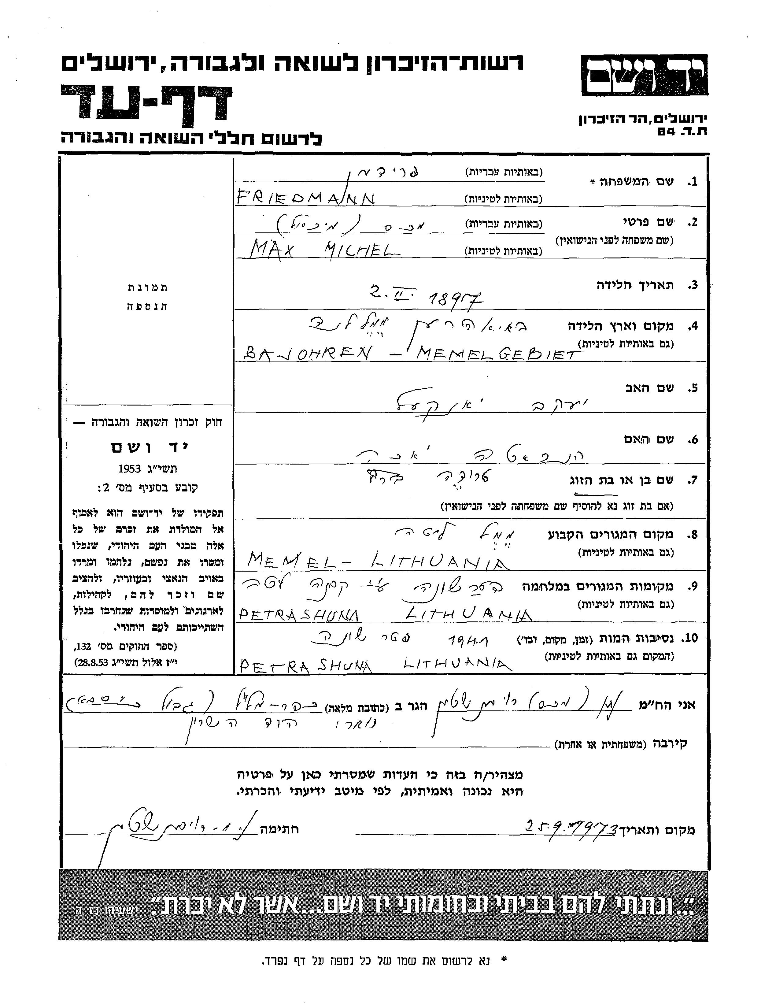 Max Michel Friedmann wurde im Jahr 1897 in Memel, Litauen geboren. Er war der Sohn von Yaakov und Henrieta Iana. Er war mit Trude, geb. Berel Verheiratet. Vor dem Zweiten Weltkrieg lebte er in Memel, Litauen. Während des Krieges war er in Petrasiunai, Litauen.