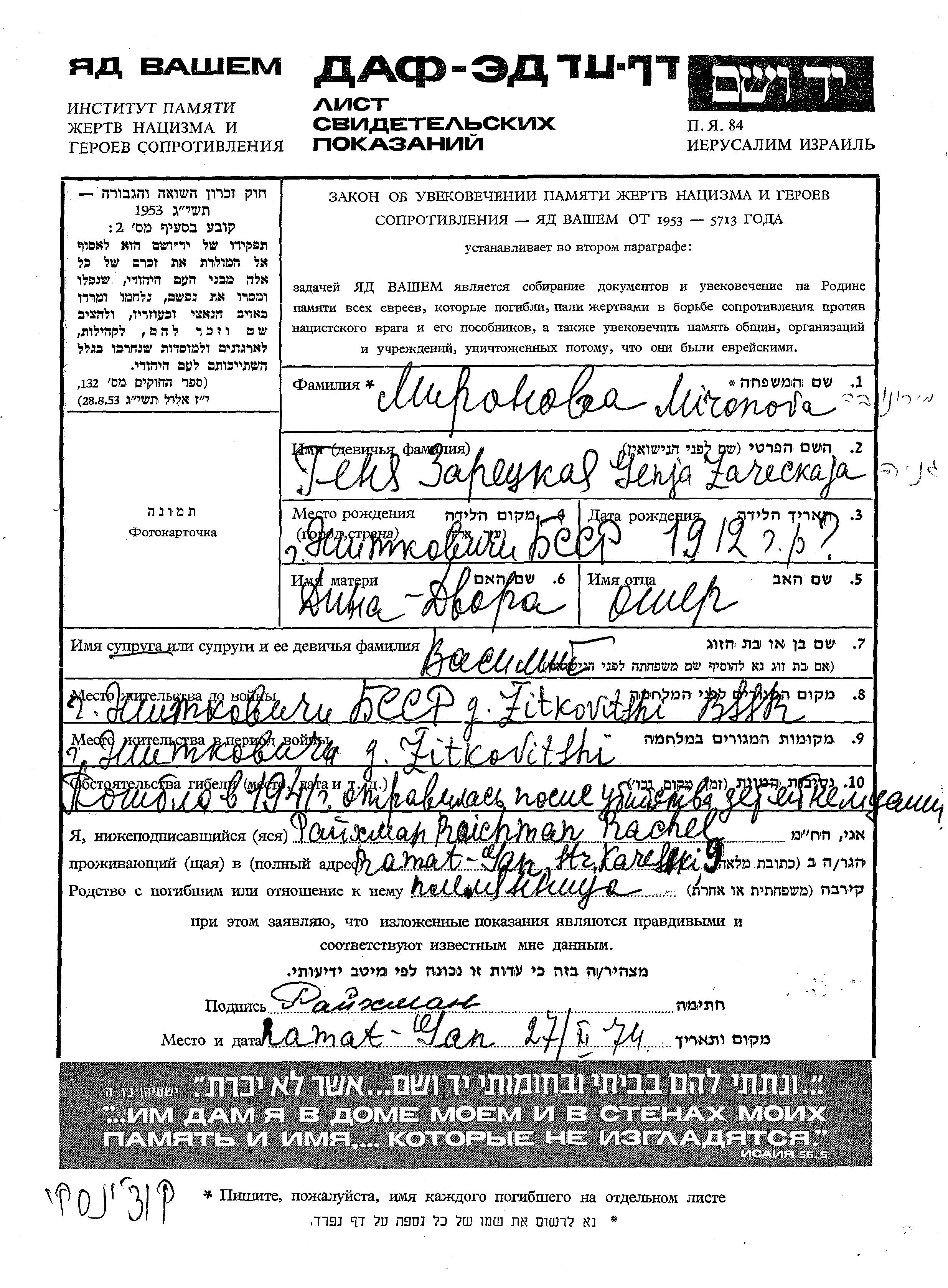 Genja Mironov, geb. Zaretzki wurde im Jahr 1912 in Zhitkovichi, Weißrussland (UdSSR) geboren. Sie war die Tochter von Osher und Dina Dvora. Sie war mit Vasili Verheiratet. Vor dem Zweiten Weltkrieg lebte sie in Zhitkovichi, Weißrussland (UdSSR). Während des Krieges war sie in Zhitkovichi, Weißrussland (UdSSR).