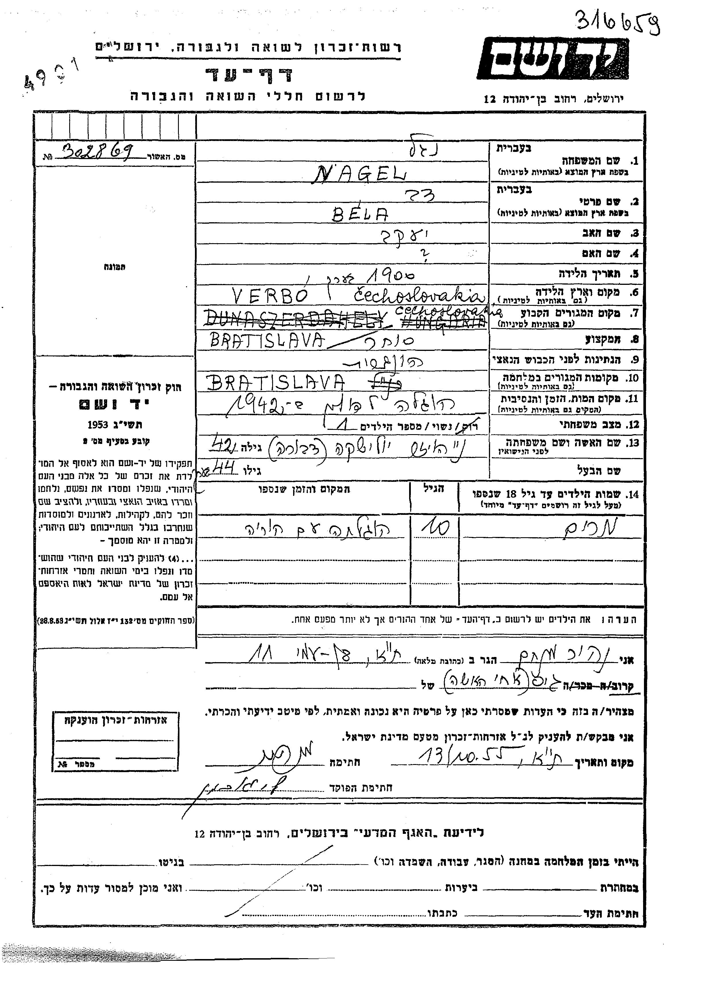 Bela Dov Nagel wurde im Jahr 1900 in Verbo, Tschechoslowakei geboren. Er war der Sohn von Yaakov. Er war Kaufmann/-frau und mit Yulia Dvora, geb. Neihoizer Verheiratet. Vor dem Zweiten Weltkrieg lebte er in Bratislava, Tschechoslowakei. Während des Krieges war er in Bratislava, Tschechoslowakei.