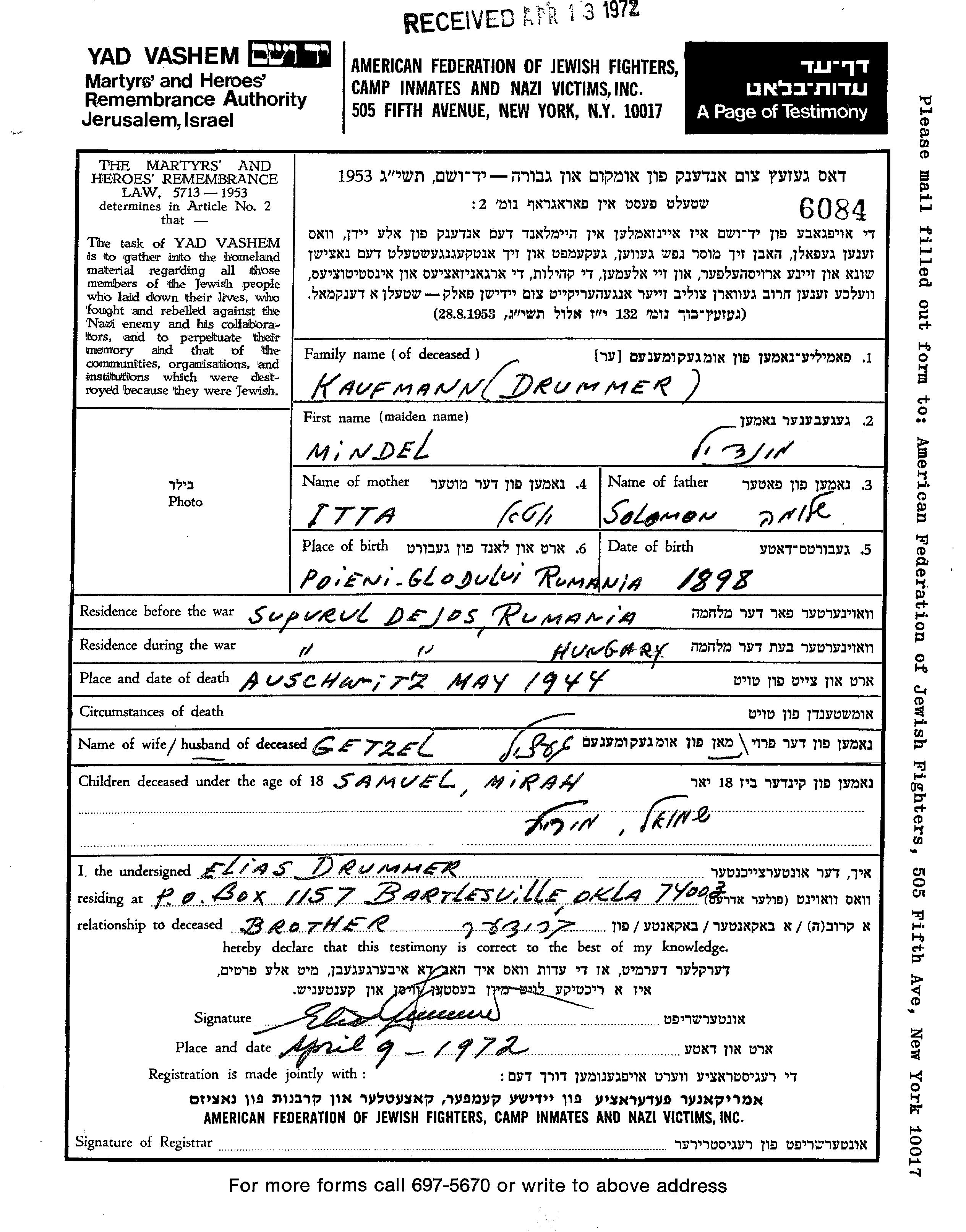 Mindl Kaufmann, geb. Drummer wurde im Jahr 1898 in Glodului, Rumänien geboren. Sie war die Tochter von Solomon und Itta Ata. Sie war mit Getzil Verheiratet. Vor dem Zweiten Weltkrieg lebte sie in Supuru de Sus, Rumänien. Während des Krieges war sie in Supurul de Sus, Rumänien.