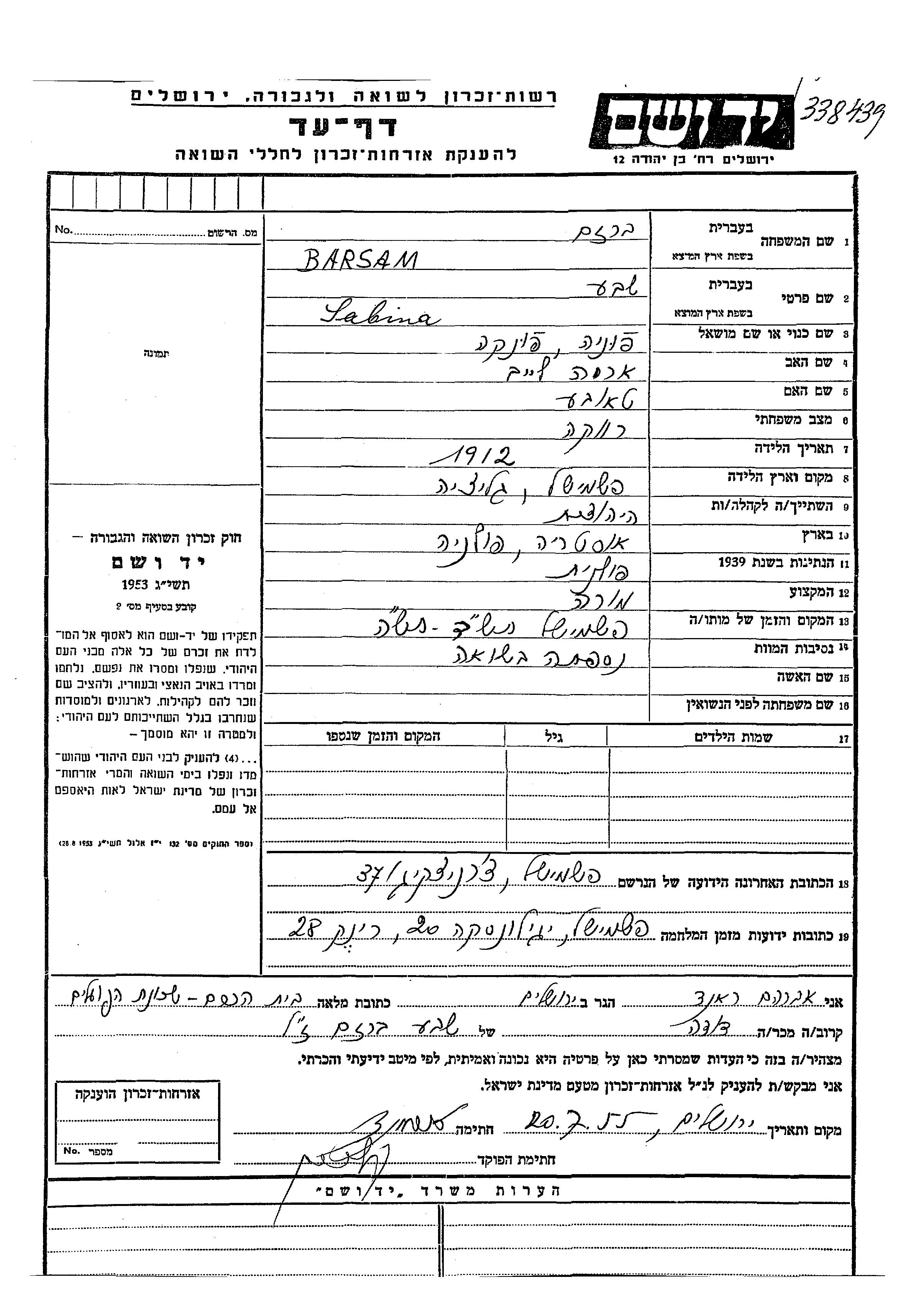 Sabina Sheva Barsam wurde im Jahr 1912 in Przemysl, Polen geboren. Sie war die Tochter von Arie Leib und Taube. Sie war Lehrer/in und Ledig. Vor dem Zweiten Weltkrieg lebte sie in Polen. Während des Krieges war sie in Przemysl, Polen.