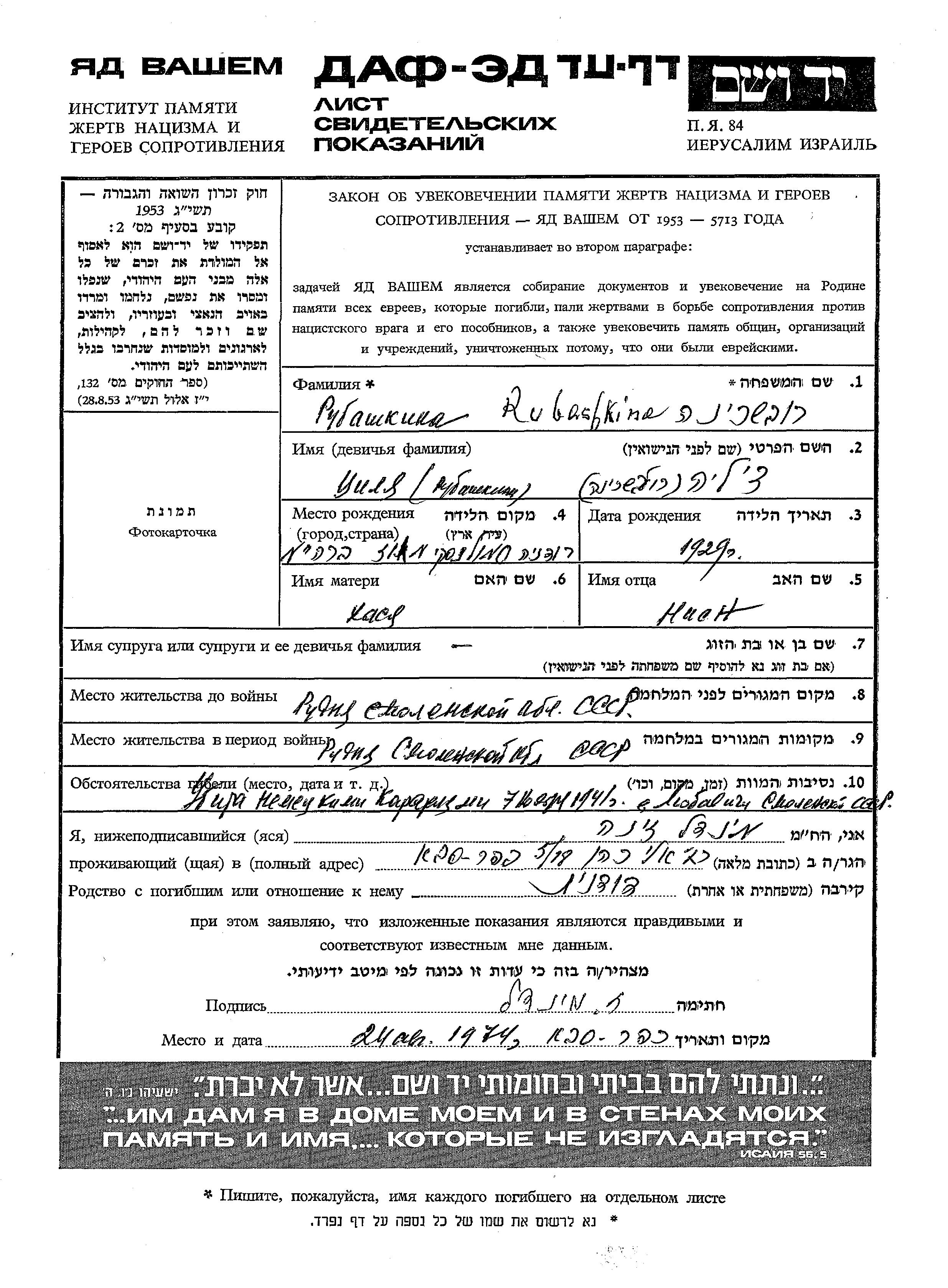 Tzilya Rubashkin wurde im Jahr 1929 in Rudnya, Russland (UdSSR) geboren. Sie war die Tochter von Nisan und Khasya. Vor dem Zweiten Weltkrieg lebte sie in Rudnya, Russland (UdSSR). Während des Krieges war sie in Rudnya, Russland (UdSSR).