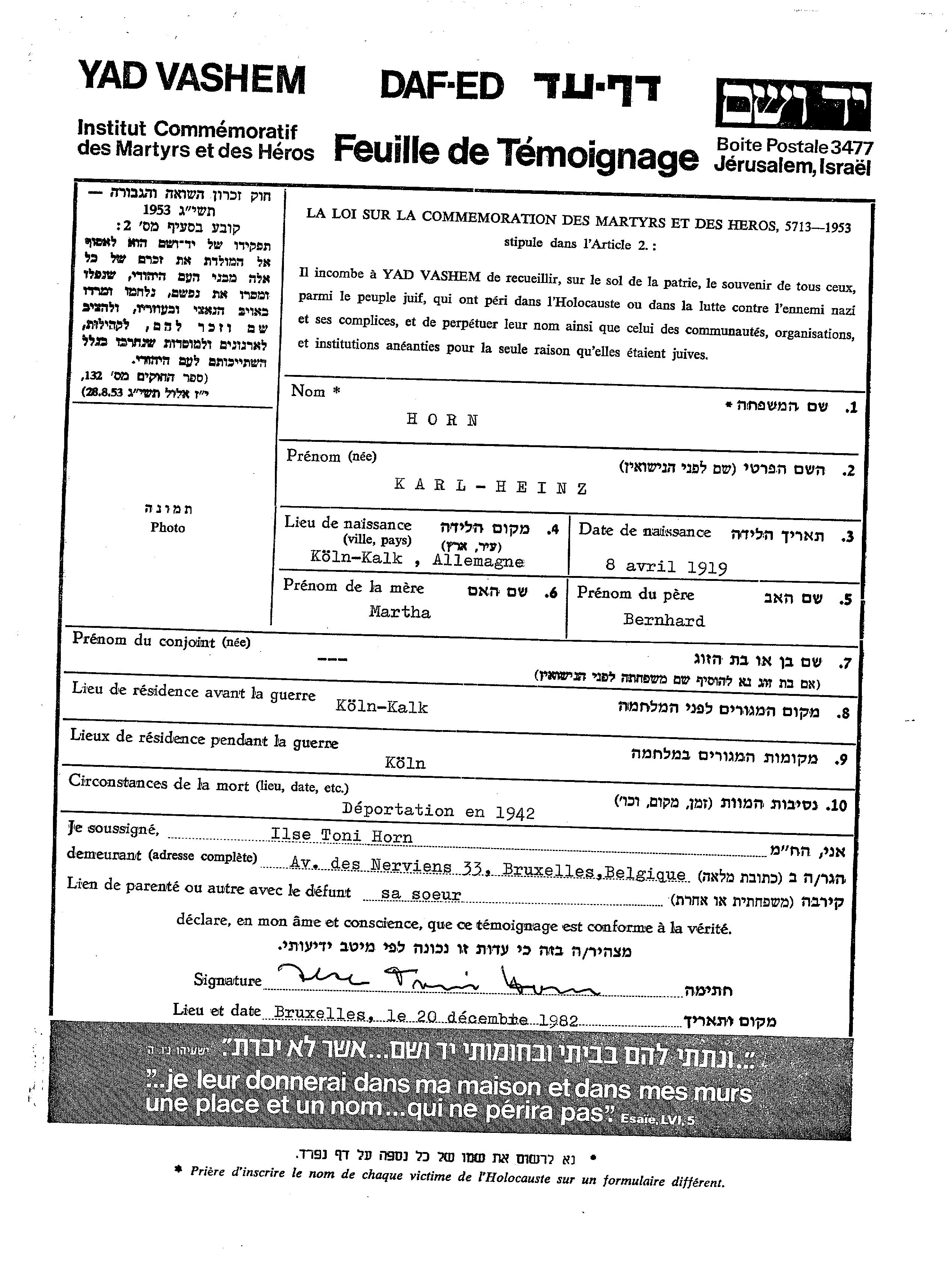 Karl Heinz Horn wurde im Jahr 1919 in Koeln Kalk, Deutsches Reich geboren. Er war der Sohn von Marta. Vor dem Zweiten Weltkrieg lebte er in Koeln Kalk, Deutsches Reich. Während des Krieges war er in Koeln, Deutsches Reich.