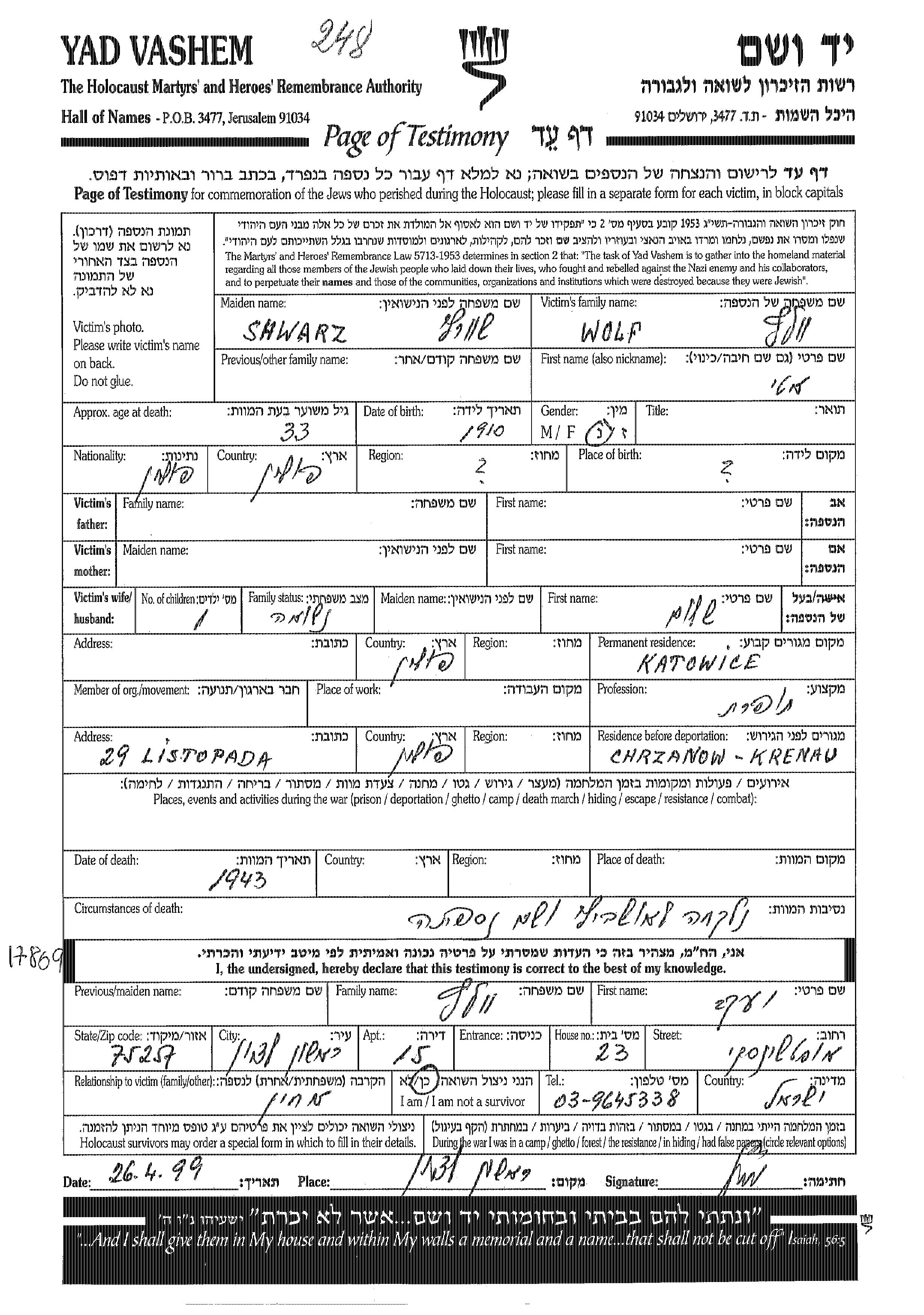 Ester Wolf, geb. Shwarz wurde im Jahr 1910 in Polen geboren. Sie war Modistin und mit Shalom Verheiratet. Vor dem Zweiten Weltkrieg lebte sie in Katowice, Polen. Während des Krieges war sie in Chrzanow, Polen.