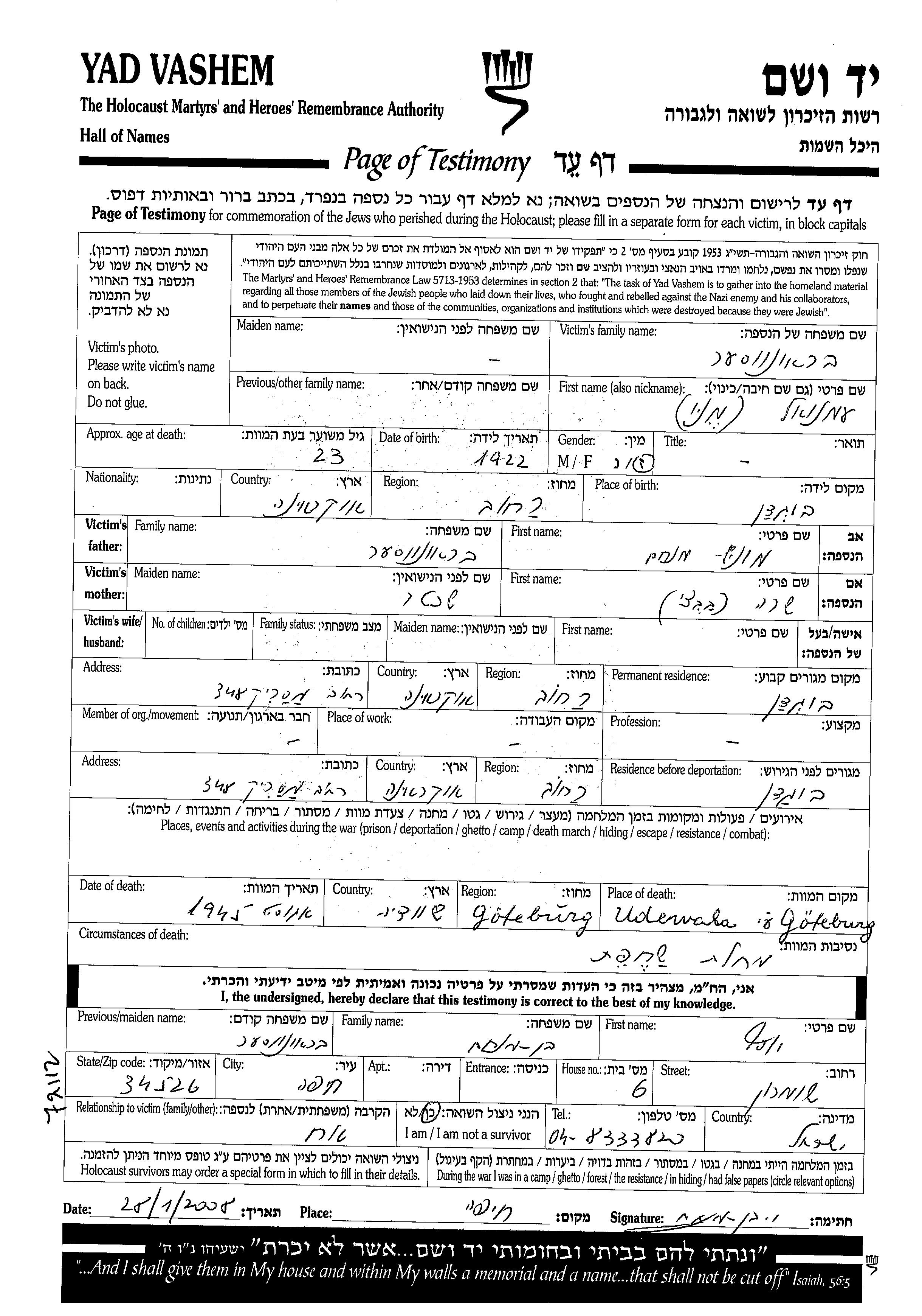 Emanuel Meno Braunvaser wurde im Jahr 1922 in Bogdan, Tschechoslowakei geboren. Er war der Sohn von Menashe Menakhem und Sara Babchi, geb. Shekhter. Vor dem Zweiten Weltkrieg lebte er in Bogdan, Tschechoslowakei. Während des Krieges war er in Bogdan, Tschechoslowakei.