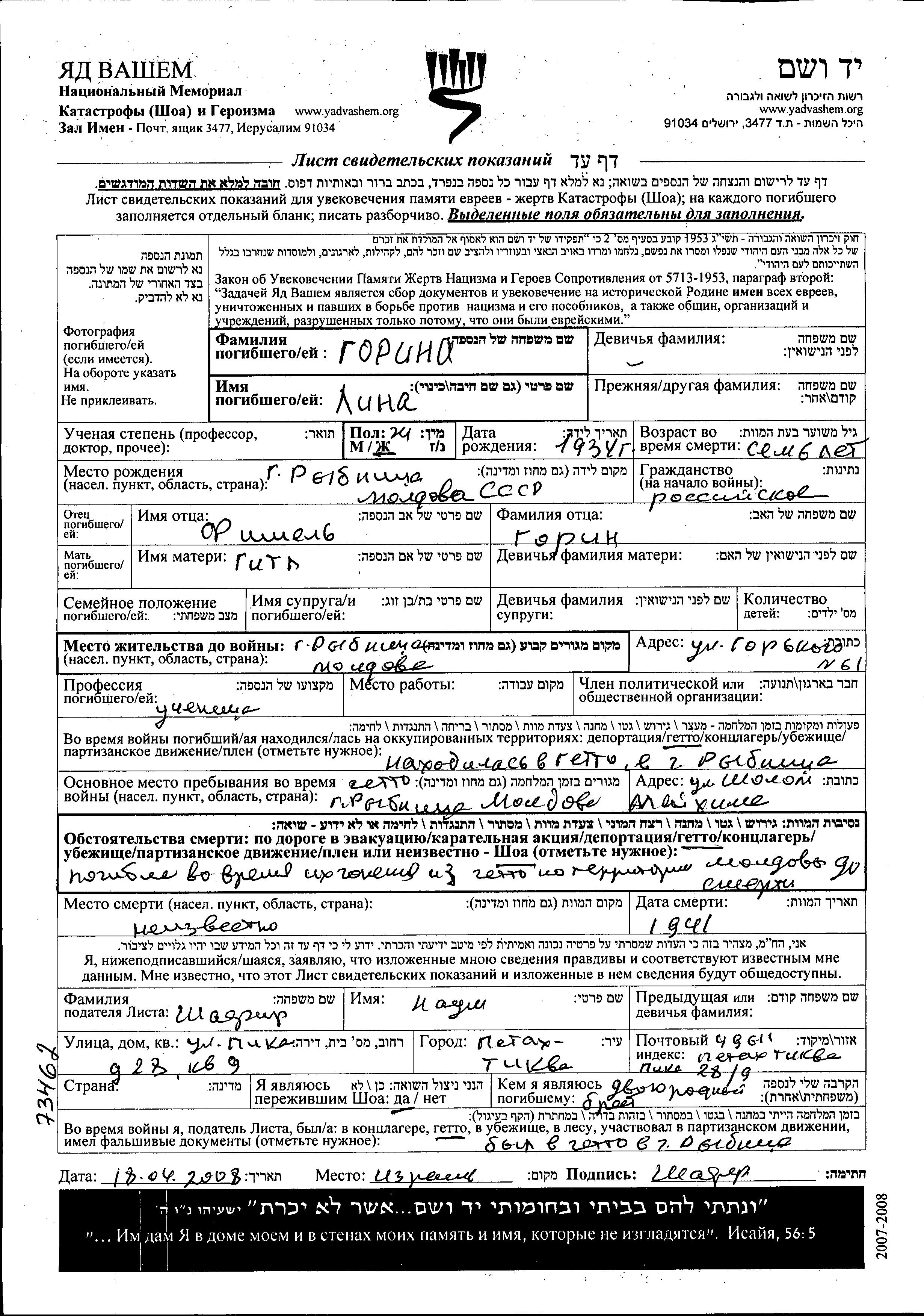 Lina Gorina wurde im Jahr 1934 in Rybnitsa, Ukraine (UdSSR) geboren. Sie war die Tochter von Fishel und Gitl. Sie war Schüler/-in. Vor dem Zweiten Weltkrieg lebte sie in Rybnitsa, Ukraine (UdSSR). Während des Krieges war sie in Rybnitsa, Ukraine (UdSSR).