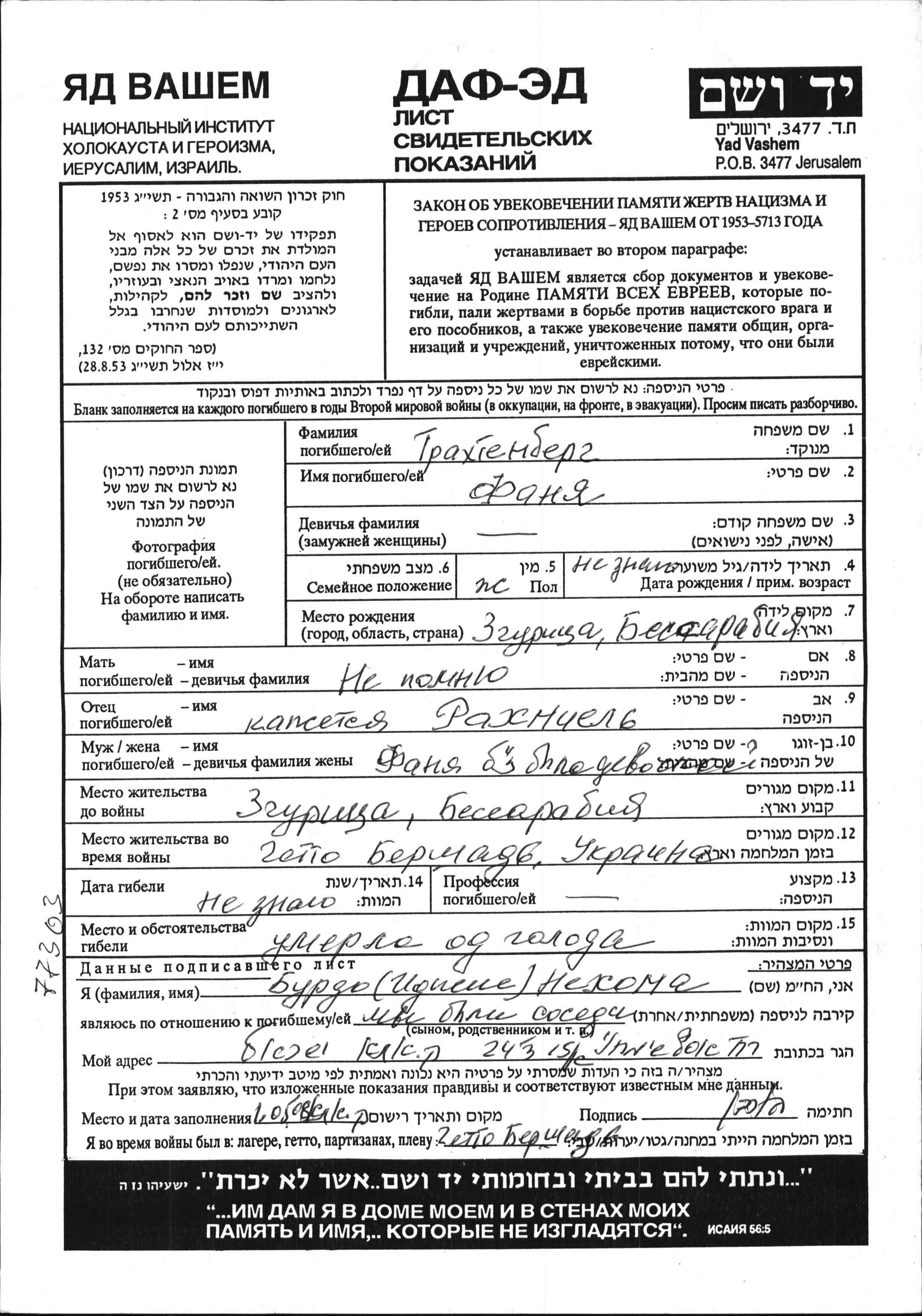 Fanya Trakhtenberg wurde in Zguritsa, Rumänien geboren. Sie war die Tochter von Rakhmiyel. Sie war Kind. Vor dem Zweiten Weltkrieg lebte sie in Zguritsa, Rumänien. Während des Krieges war sie in Bershad, Ukraine (UdSSR).