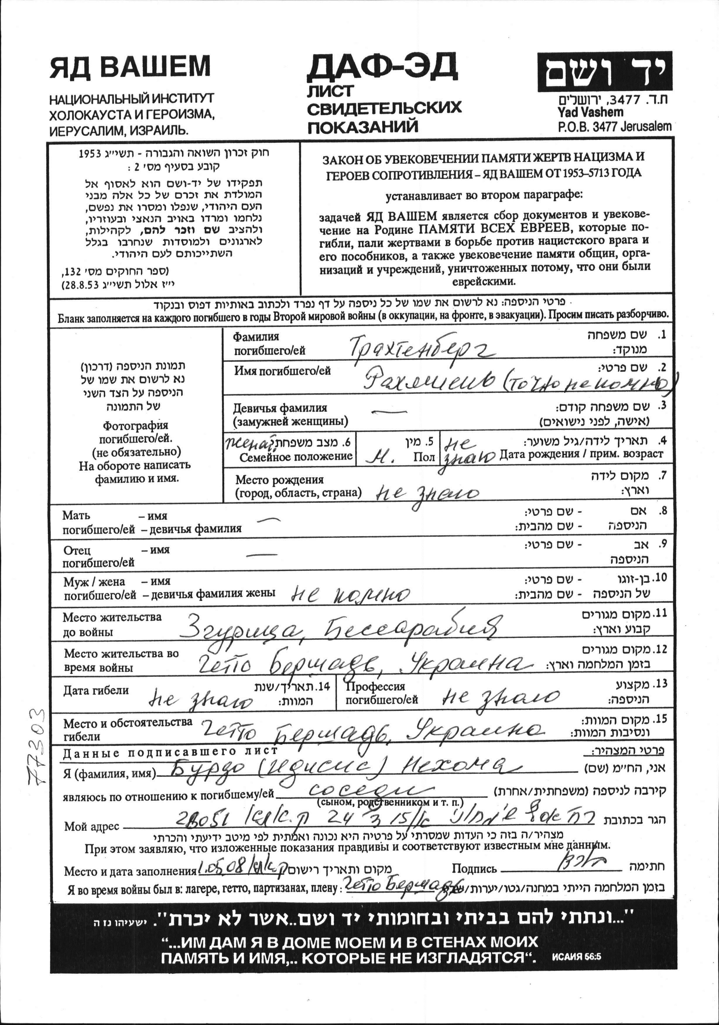Rakhmiyel Trakhtenberg. Er war Verheiratet. Vor dem Zweiten Weltkrieg lebte er in Zguritsa, Rumänien. Während des Krieges war er in Bershad, Ukraine (UdSSR).