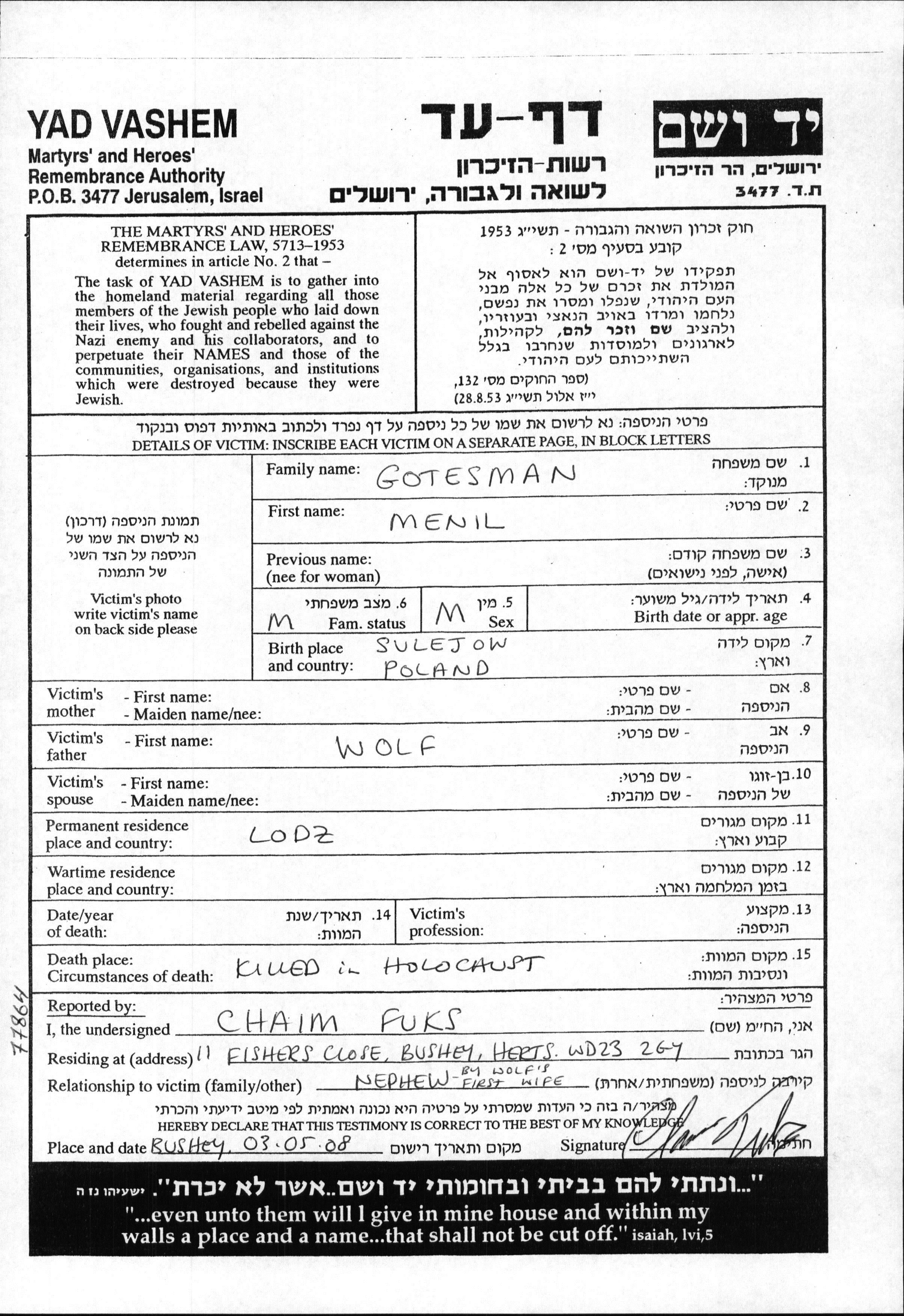 Menil Gotesman wurde in Sulejow, Polen geboren. Er war der Sohn von Wolf. Er war Verheiratet. Vor dem Zweiten Weltkrieg lebte er in Lodz, Polen. Während des Krieges war er in Lodz, Polen.