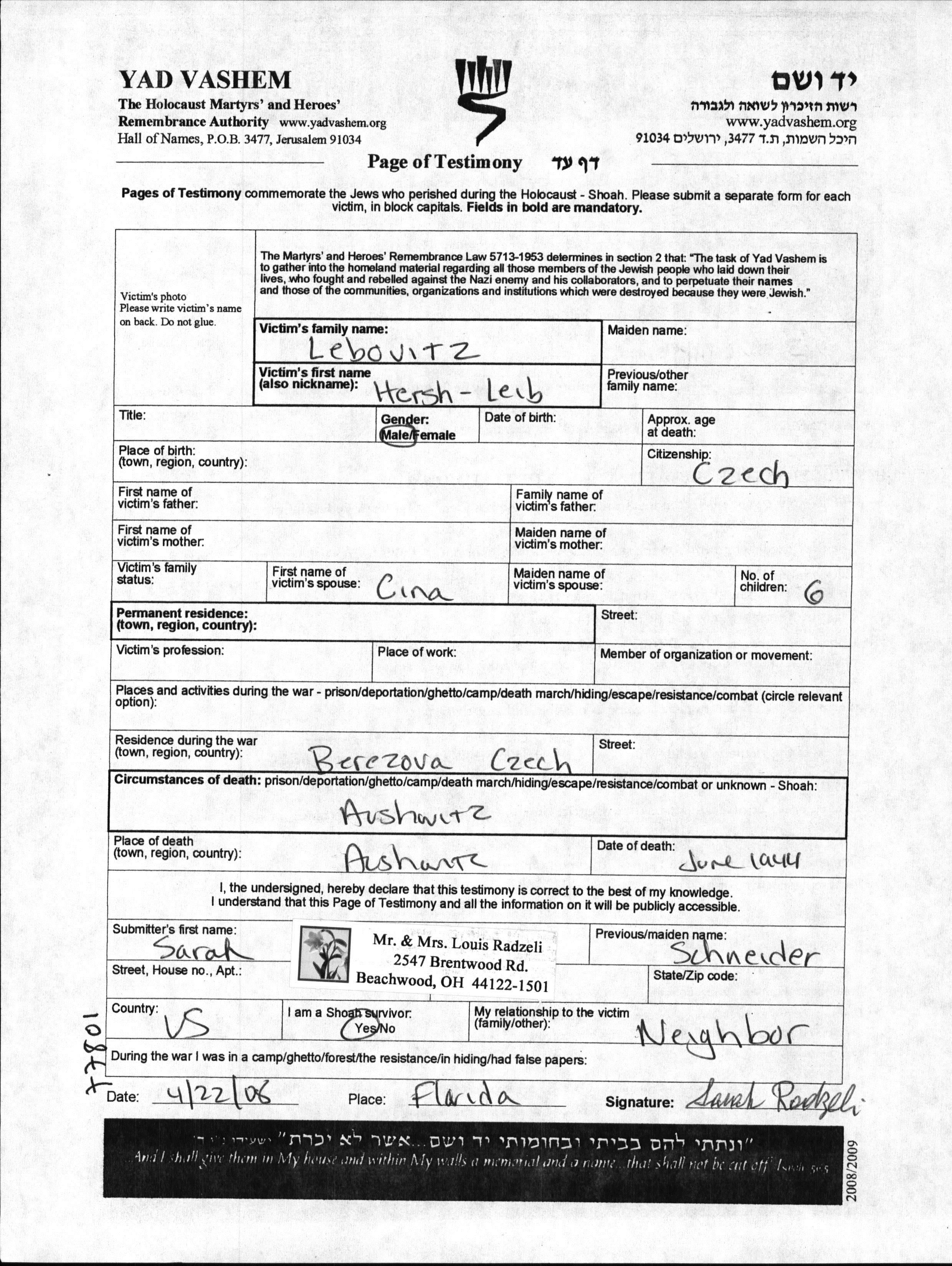 Hersh Leib Lebovitz. Er war mit Cina Verheiratet. Vor dem Zweiten Weltkrieg lebte er in Berezova, Tschechoslowakei. Während des Krieges war er in Berezova, Tschechoslowakei.