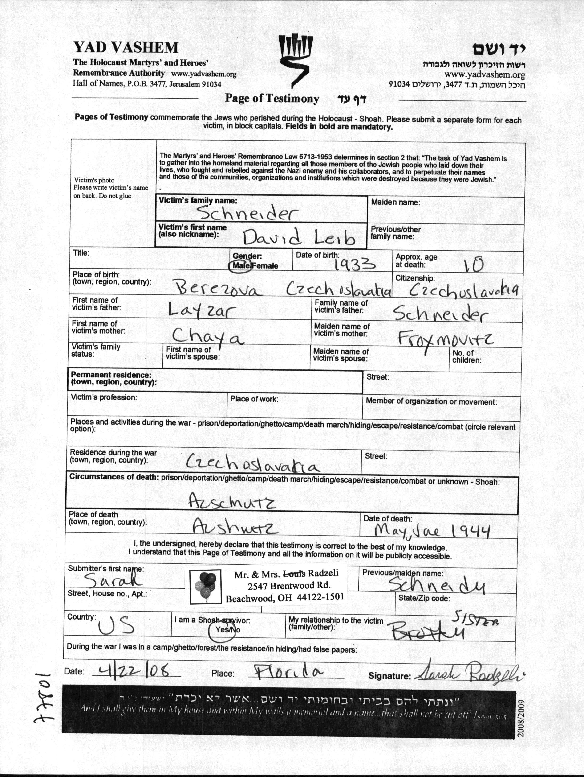 David Leib Schneider wurde im Jahr 1933 in Berezovo, Tschechoslowakei geboren. Er war der Sohn von Layzar und Chaya, geb. Froymovitz. Er war Kind. Vor dem Zweiten Weltkrieg lebte er in Berezovo, Tschechoslowakei. Während des Krieges war er in Tschechoslowakei.