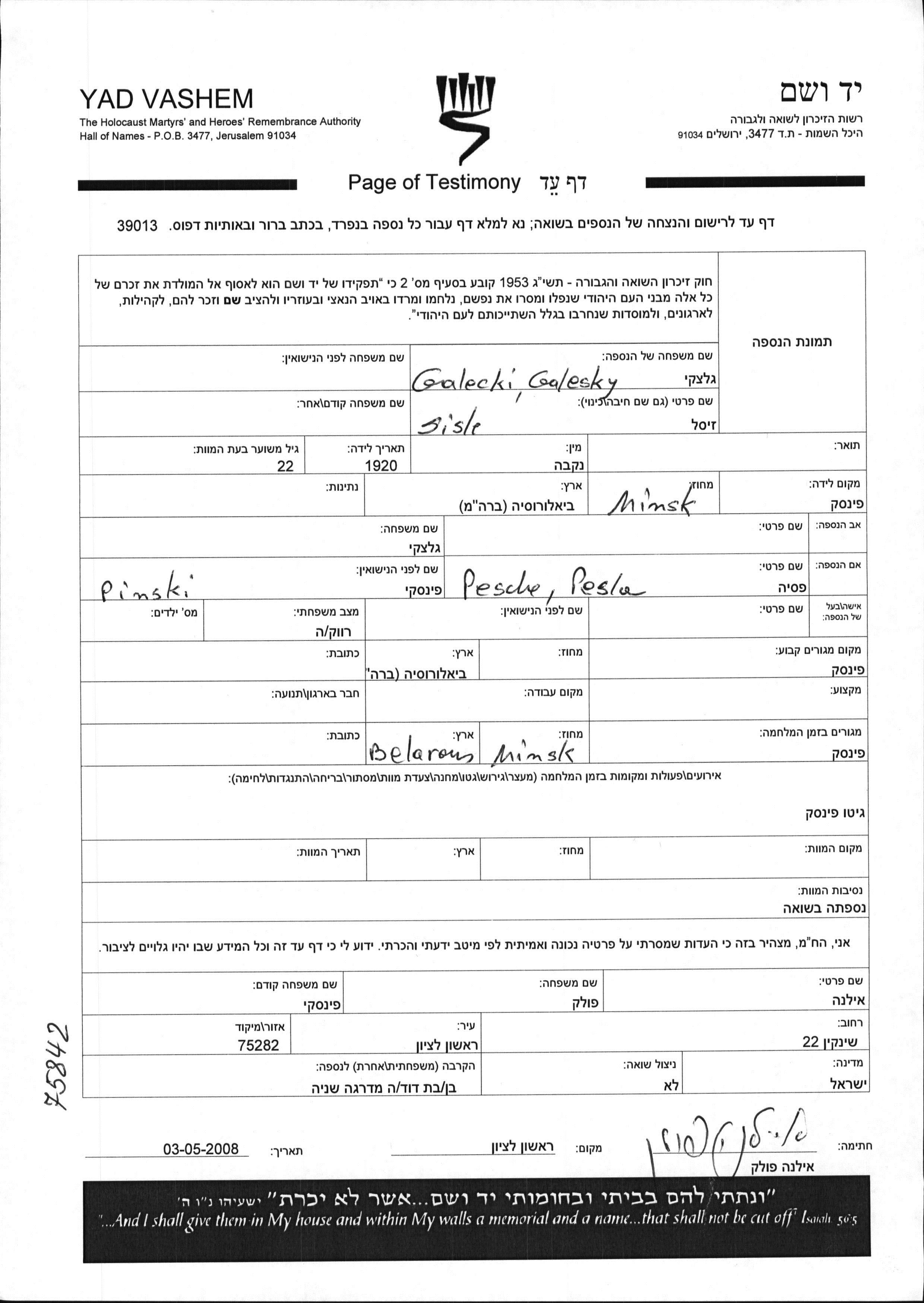 Zysl Galetzki wurde im Jahr 1920 in Pinsk, Polen geboren. Sie war die Tochter von Pesia, geb. Pinski. Sie war Ledig. Vor dem Zweiten Weltkrieg lebte sie in Pinsk, Polen. Während des Krieges war sie in Pinsk, Polen.
